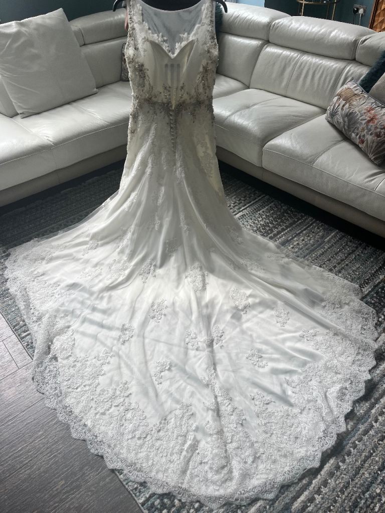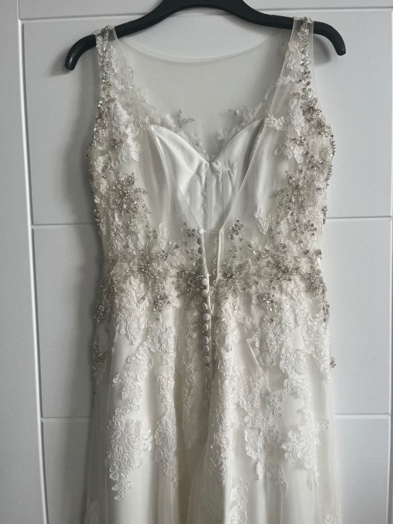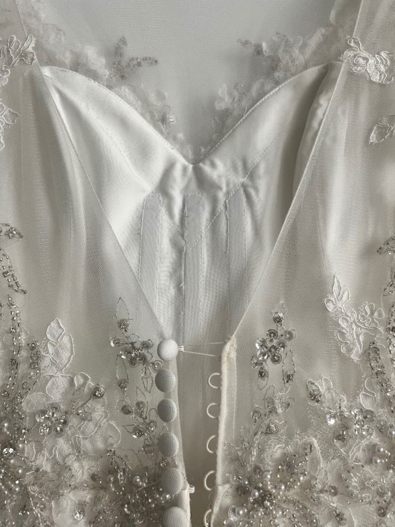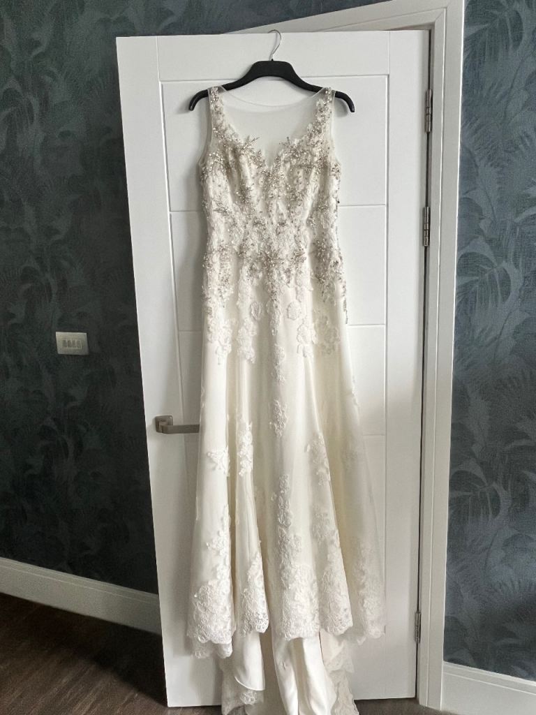 Morilee wedding dress stunning design embellished with stones and pearls. Very flattering on with fitted bodice which is low cut in the front and backless. Needs to be seen to be appreciated. UK size 12