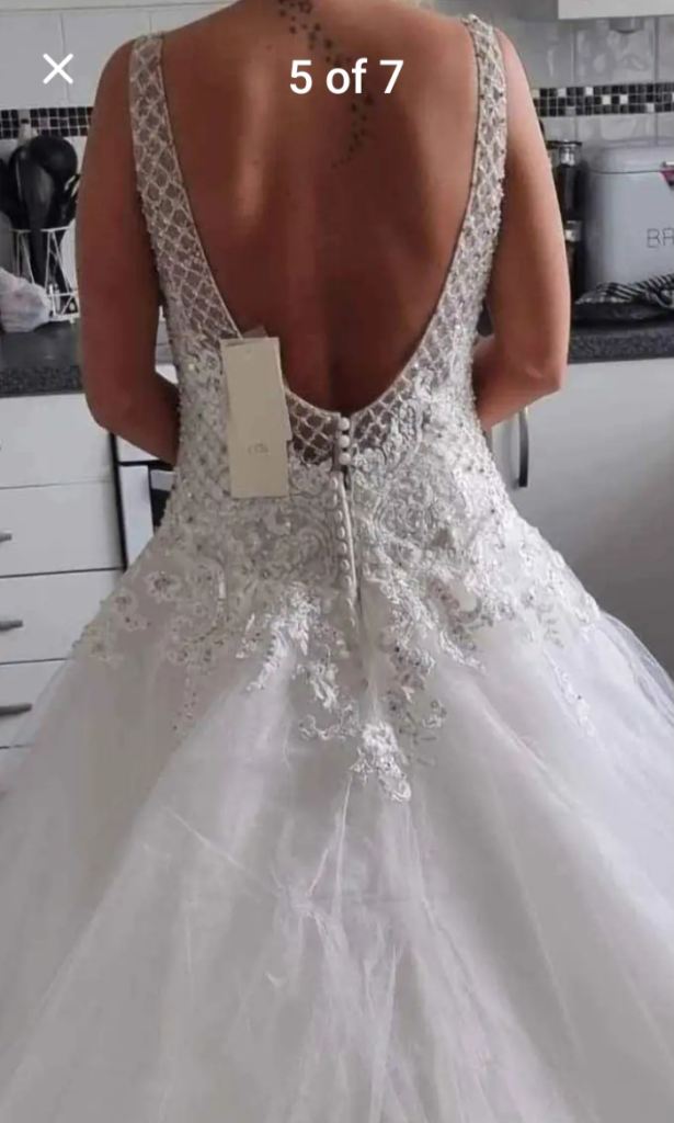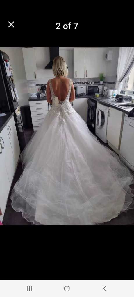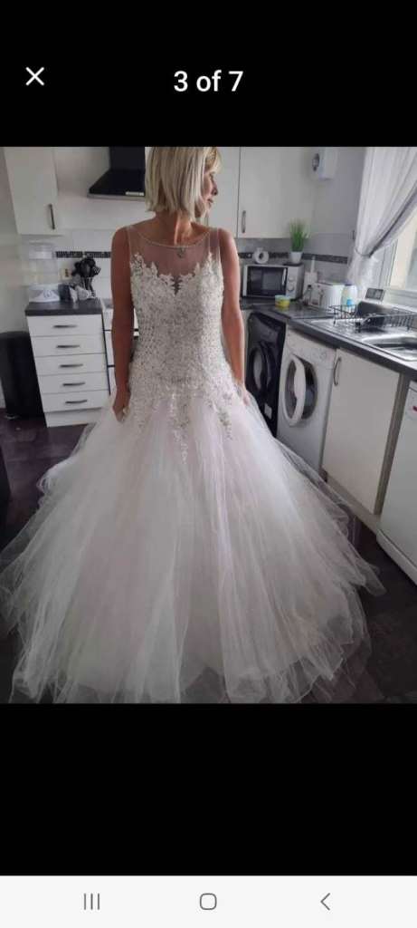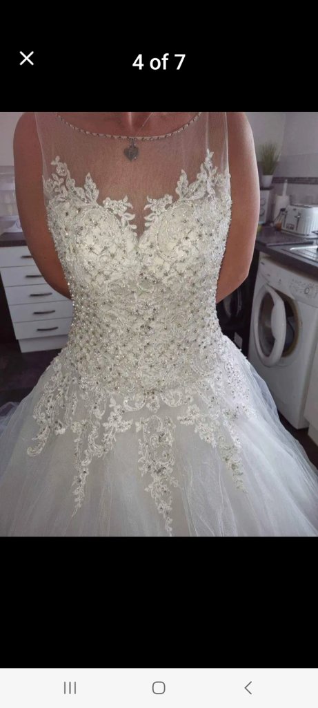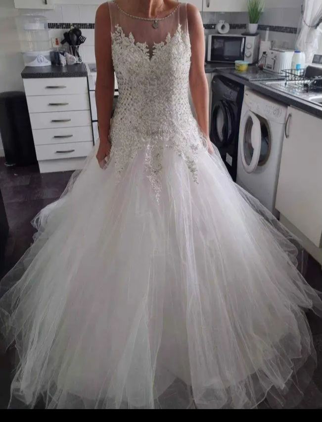 Princess tulle ivory wedding dress. New with tags. £1700 sell £ 600 ono. Beautiful beaded sparkly necklace with mesh top bodice . Size 14 button open back. Sleeveless. Perfect for 5'6 to 5'8 long trail.