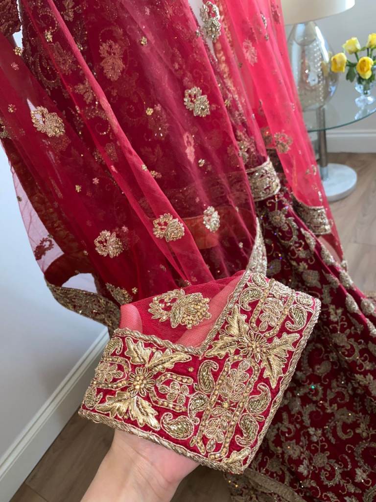 Beautiful heavy detailed bridal lehenga with trail, skirt and net dupatta with large border