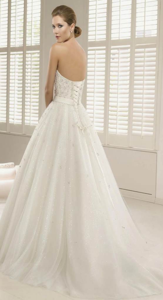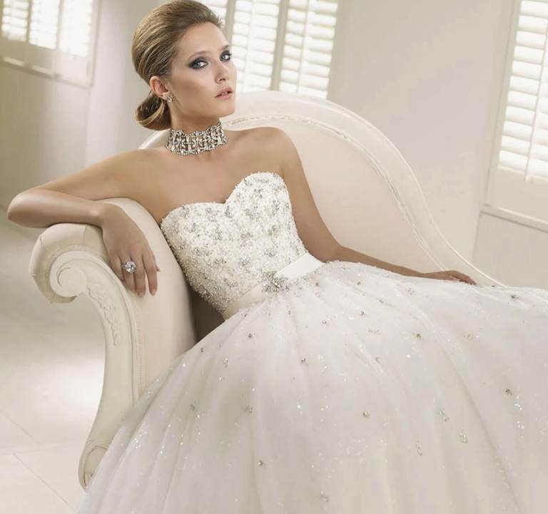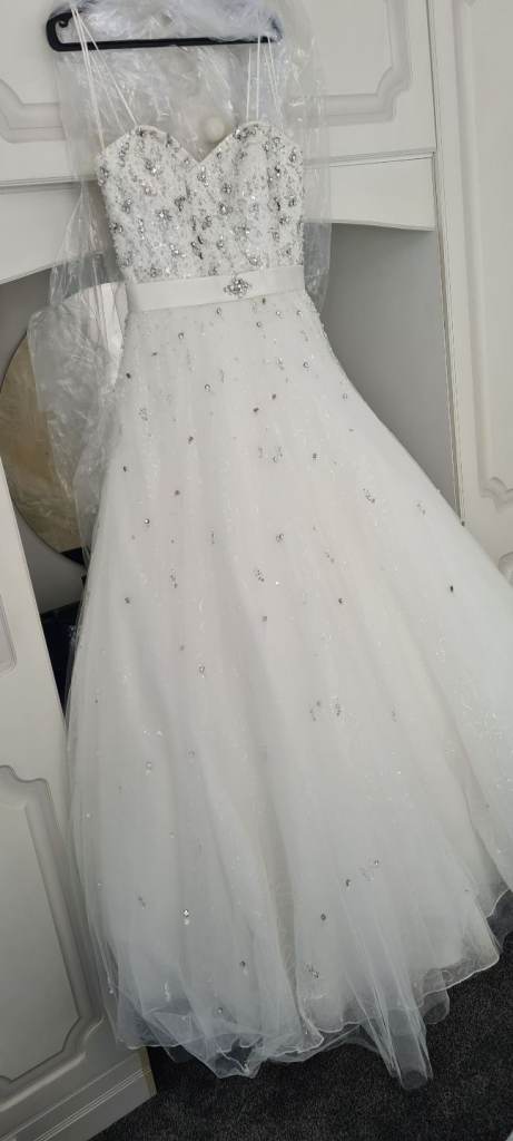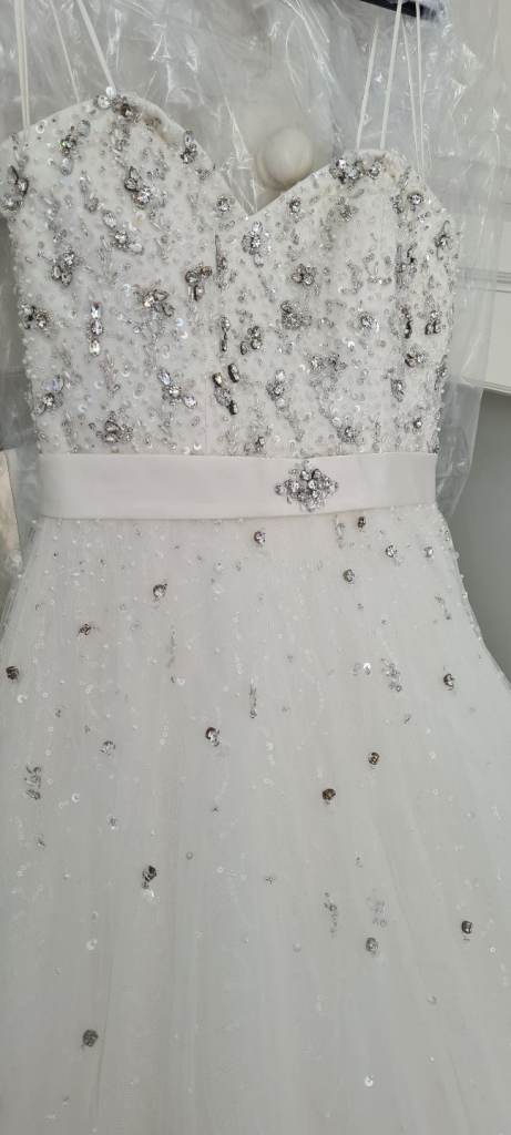 Beautiful sparkly ronald joyce padova wedding dress. Ball gown style with full princess style tulle sparkly skirt. Corset back, with rhinestone detal all over bodice part. Sparkly sequined under layer that really catches the light. Ivory in colour. Size 12. Freshly dry cleaned.