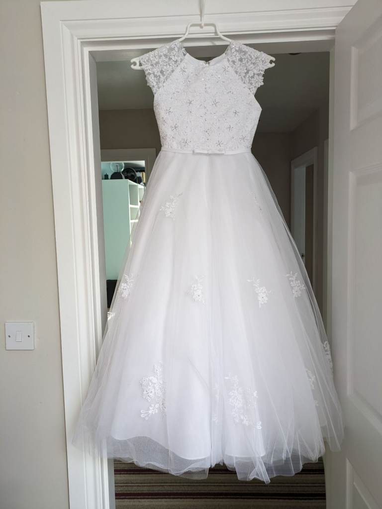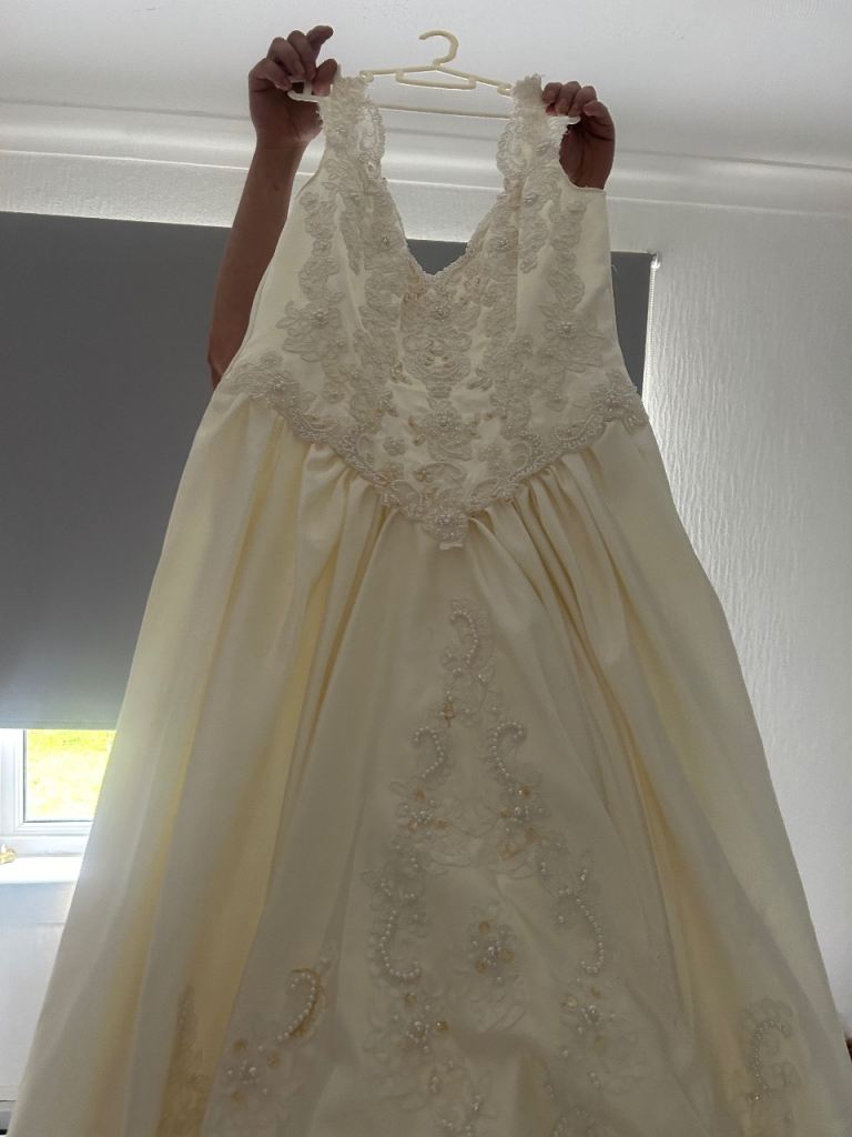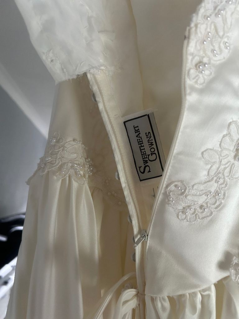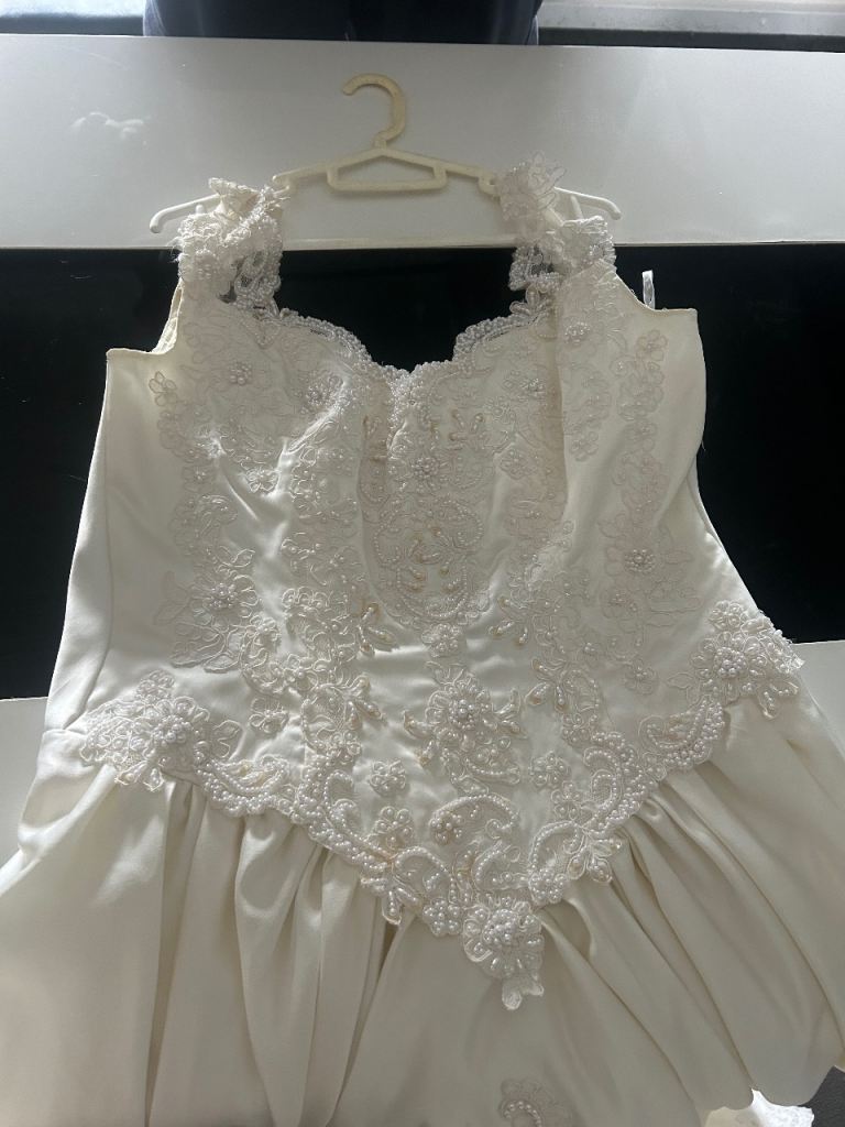 Beautiful vintage ivory wedding dress with gorgeous pearl detail and beautiful train.