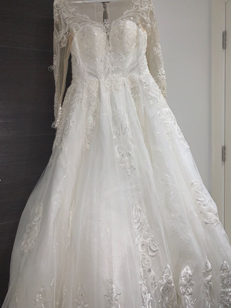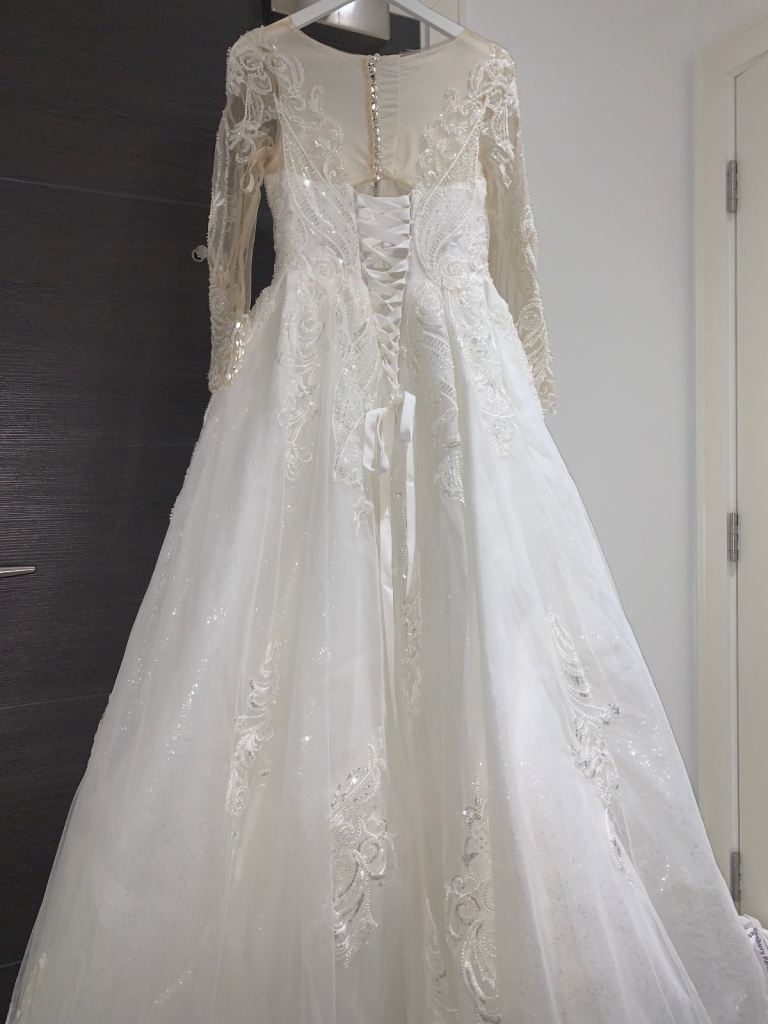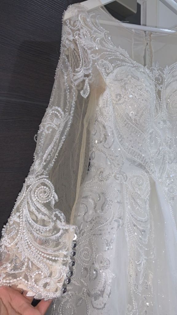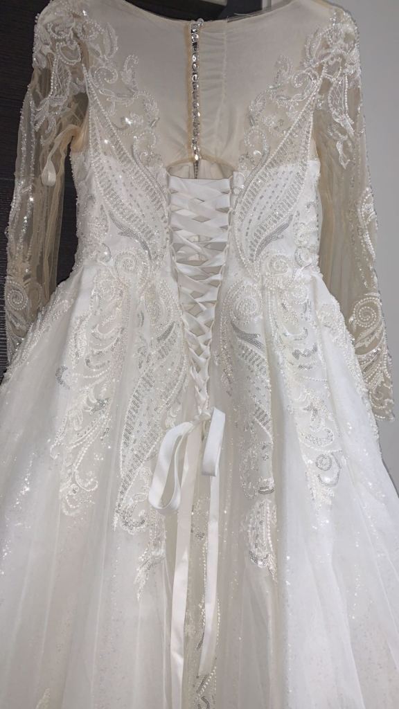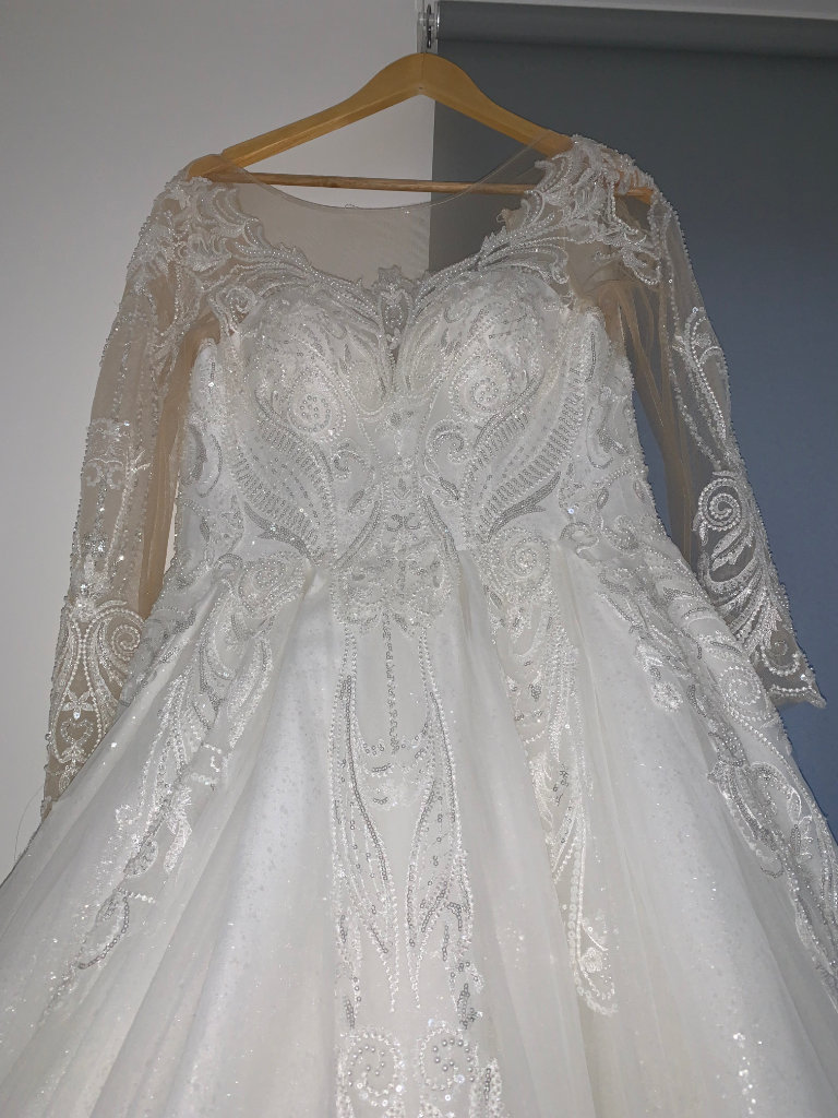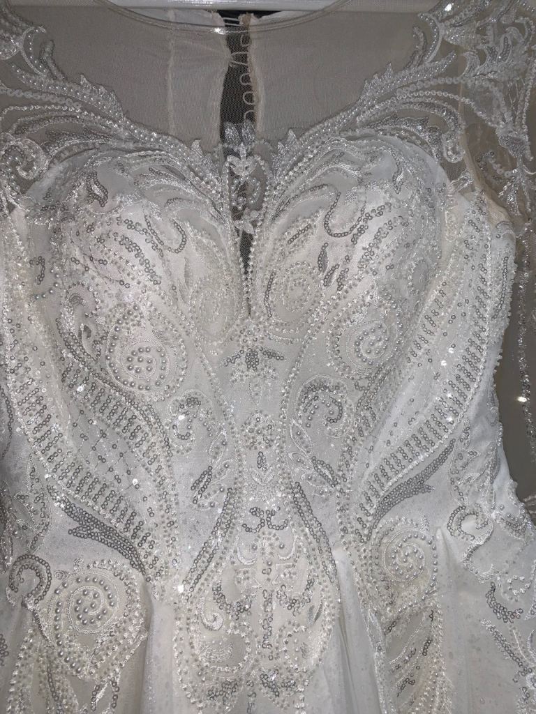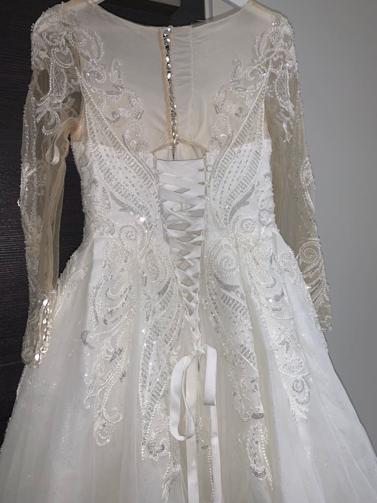 Beautiful new long sleeved wedding dress without tags , size L 12-14 true to size it can be adjusted smaller or bigger aswell to make it more looser or tighter according to your size due to corset at the back and it has buttons at the back and long ropes to tie up to make it tight or looser . It comes with short veil. Only contact if you’re serious about buying.