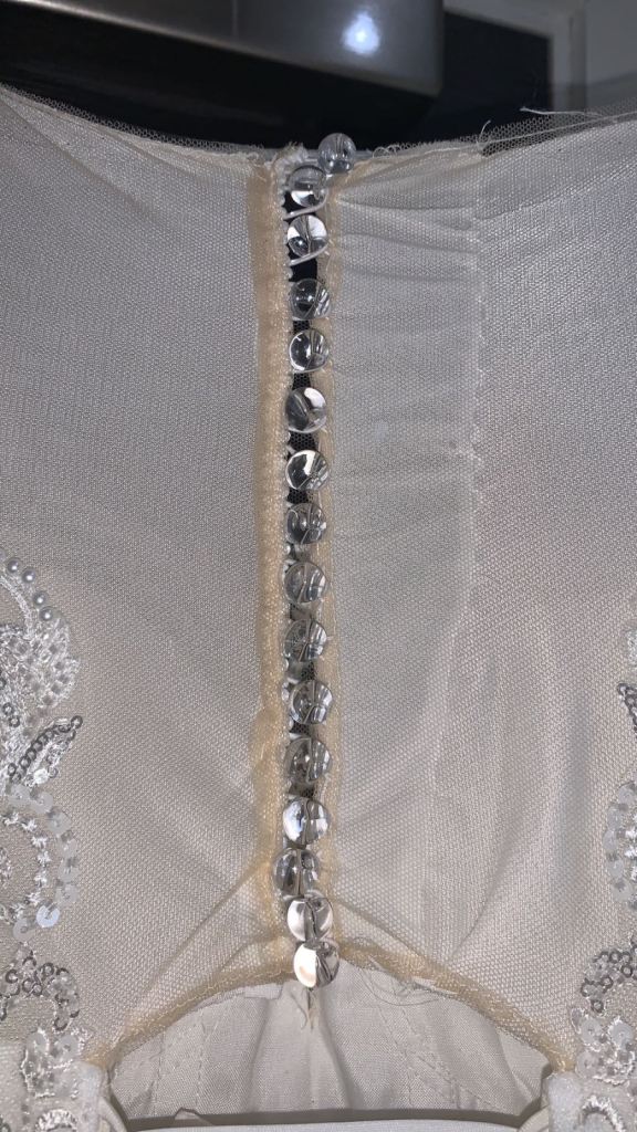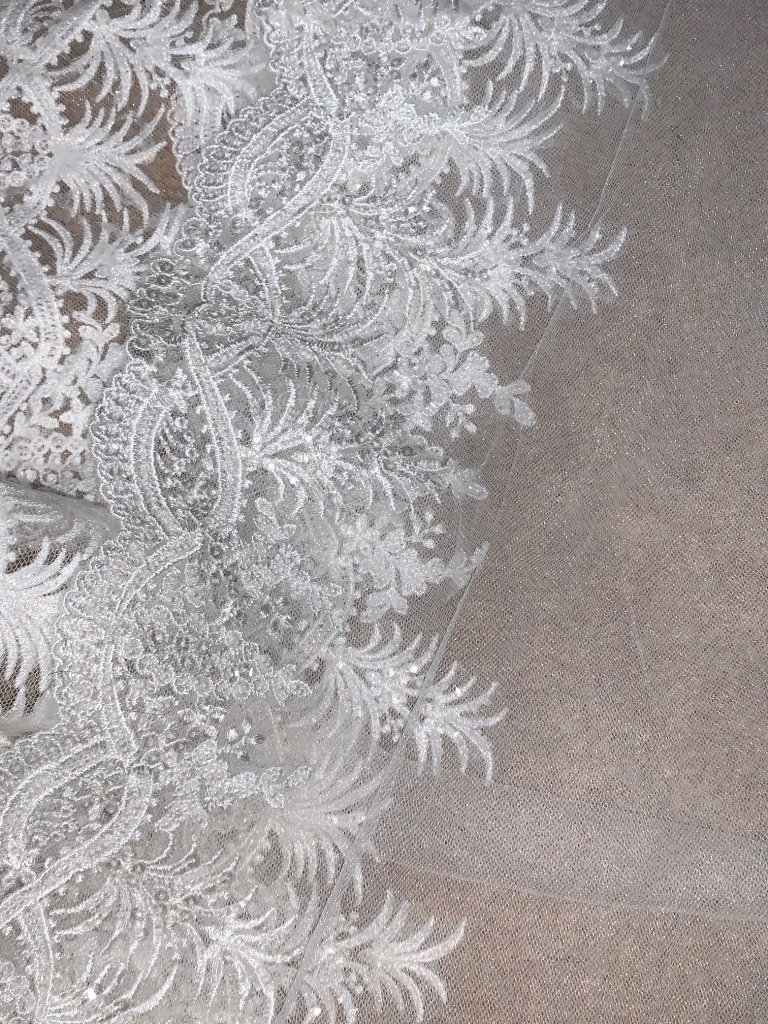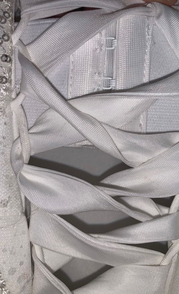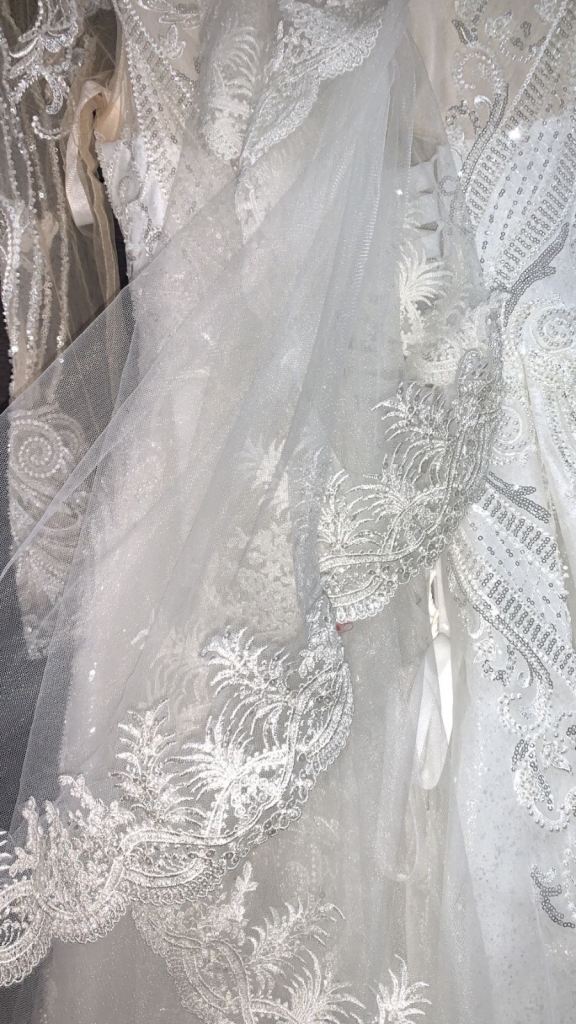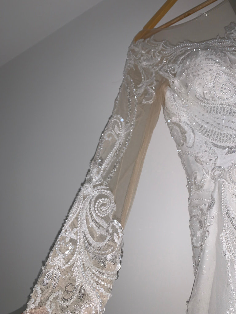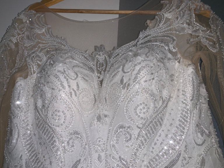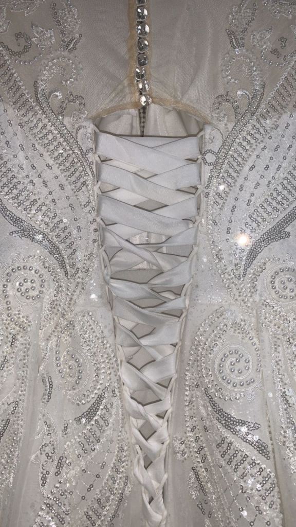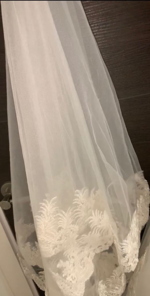 Beautiful new long sleeved wedding dress without tags , size L 12-14 true to size it can be adjusted smaller or bigger aswell to make it more looser or tighter according to your size due to corset at the back and it has buttons at the back and long ropes to tie up to make it tight or looser . It comes with short veil. Only contact if you’re serious about buying.