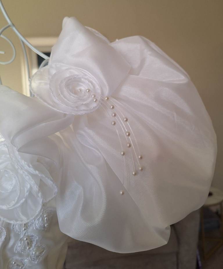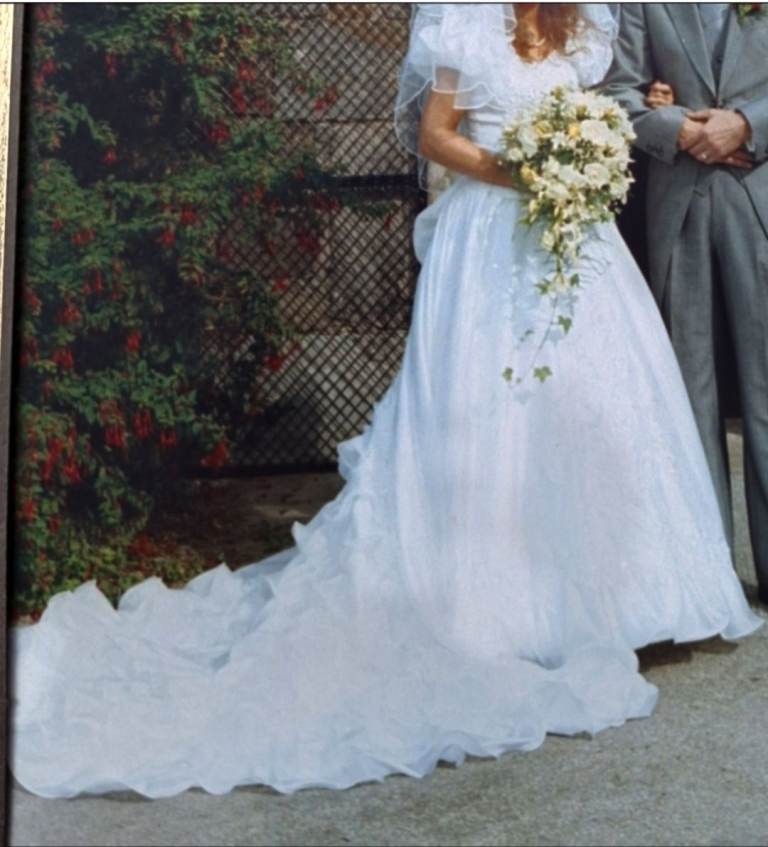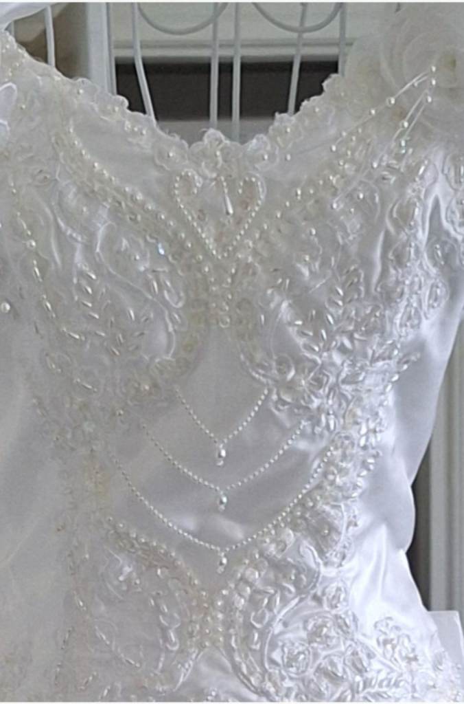 Stunning white wedding dress bought from Emma Roy of Edinburgh. Made in Italy. Size 8 to 10 and would fit height up to 5'7". Beautiful beading on the bodice. Soft ruffles on the train which is also adjustable.
