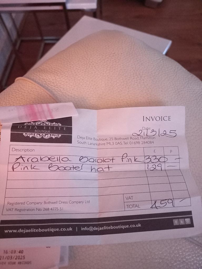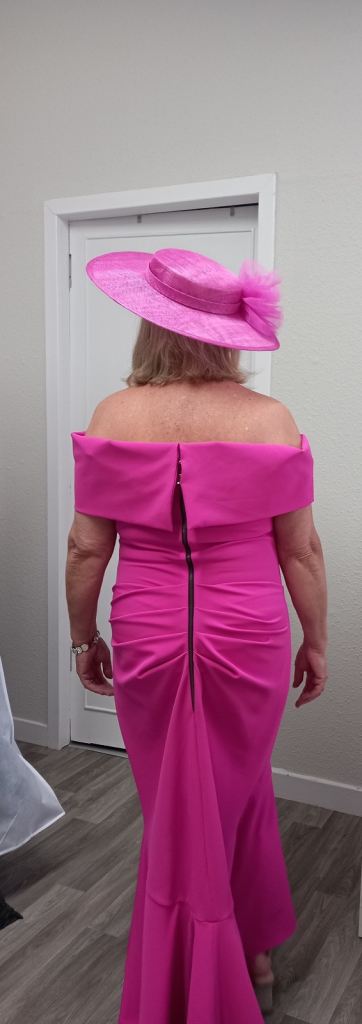 Designer bright pink Dress by Kevan John, fits size 14 comfortably. Hatinator made by Bees milliners. Dress and hat purchased from Deja Elite Boutique in Hamilton on 21 /3/25 for £459. Worn once, now dry cleaned ready to wear. Must try on and collect from Ashgill ML9. Bargain!