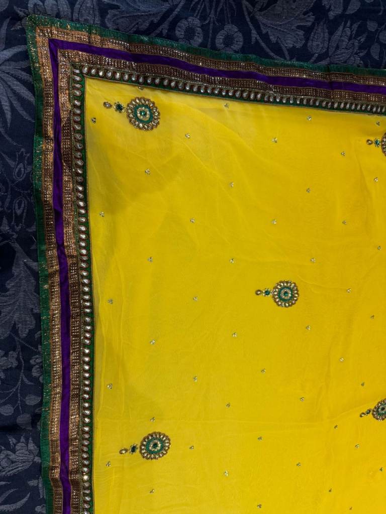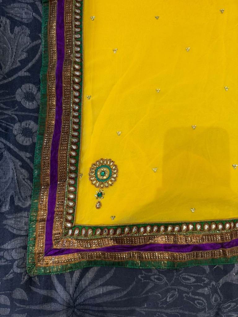 Beautiful bright yellow saree featuring elegant embroidery and decorative border detailing. The vibrant yellow colour makes it ideal for Mehndi celebrations, Haldi ceremonies, weddings, and festive occasions.