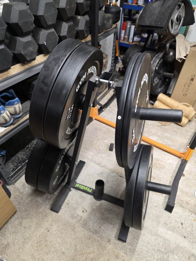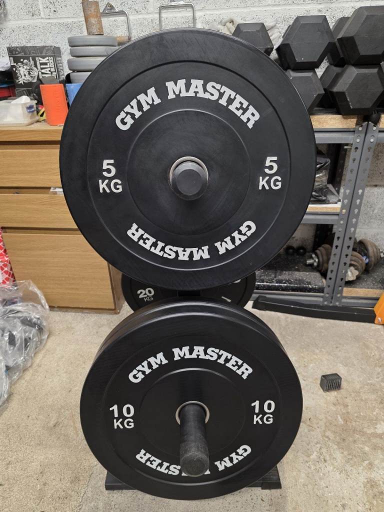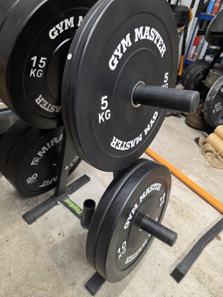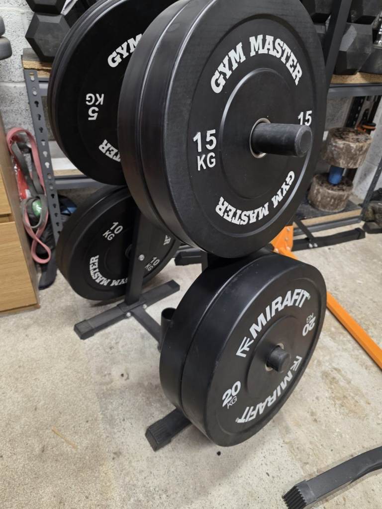 Posting for 7+ years100kg Olympic 2 inch bumper plate set + weight plate tree (Mirafit / Gym Master)