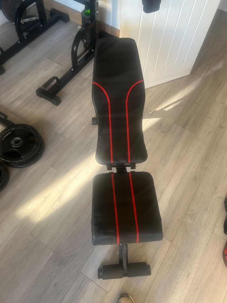 Includes Olympic weight plates, 20kg Olympic bench press bar, adjustable incline bench, and heavy-duty squat rack.