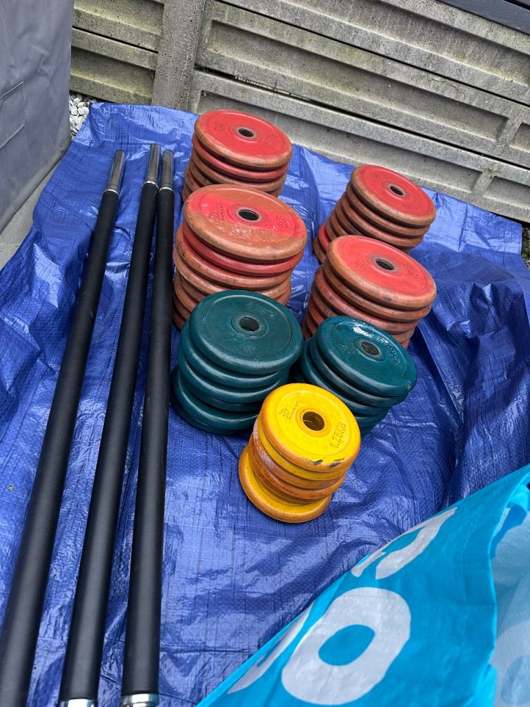Posting for 5+ yearsWeight plates (187.6kg total) with bars and clips