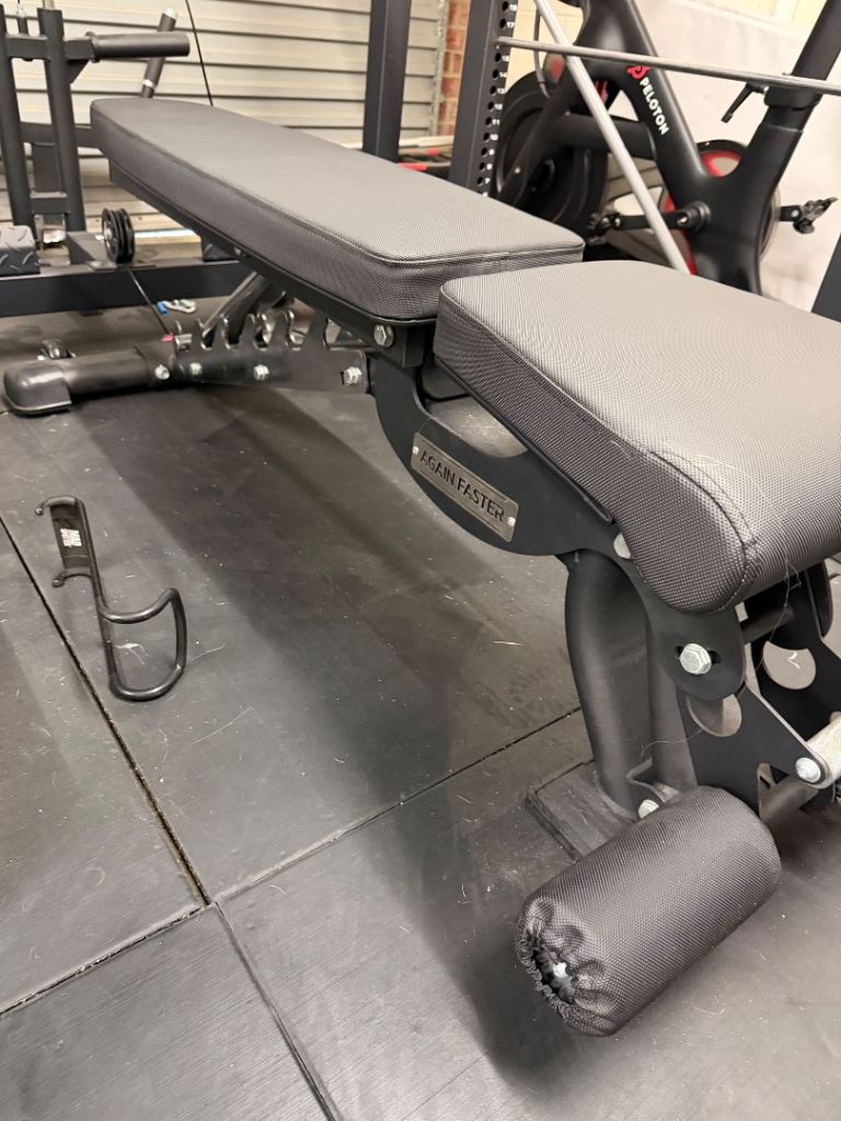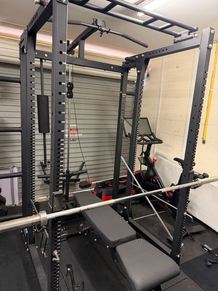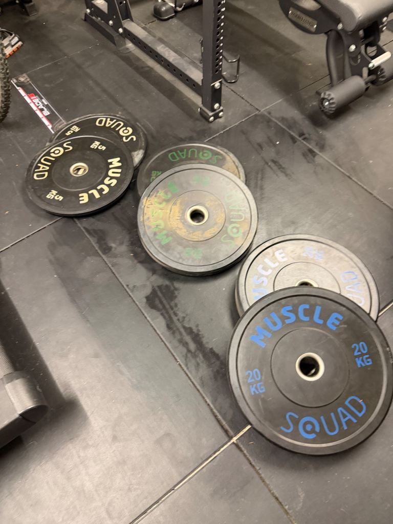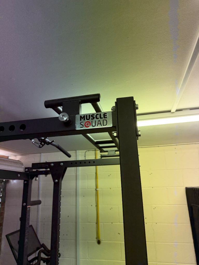 Fold away squats rack, Olympic weights and barbell from muscle squad. Brad new bench from again faster.
