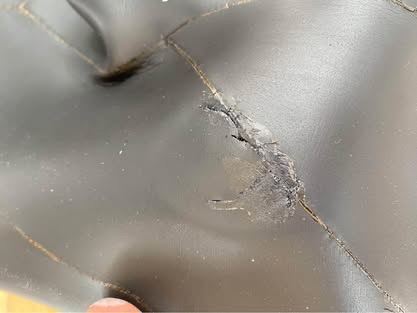 One nail/ finger rip on the top of left leg, professional repaired , see two photos.