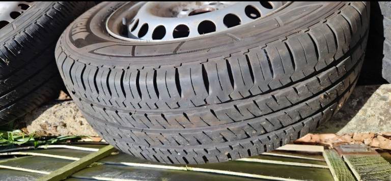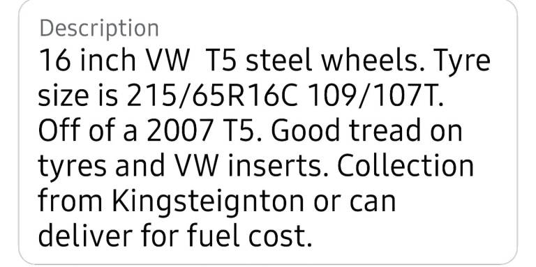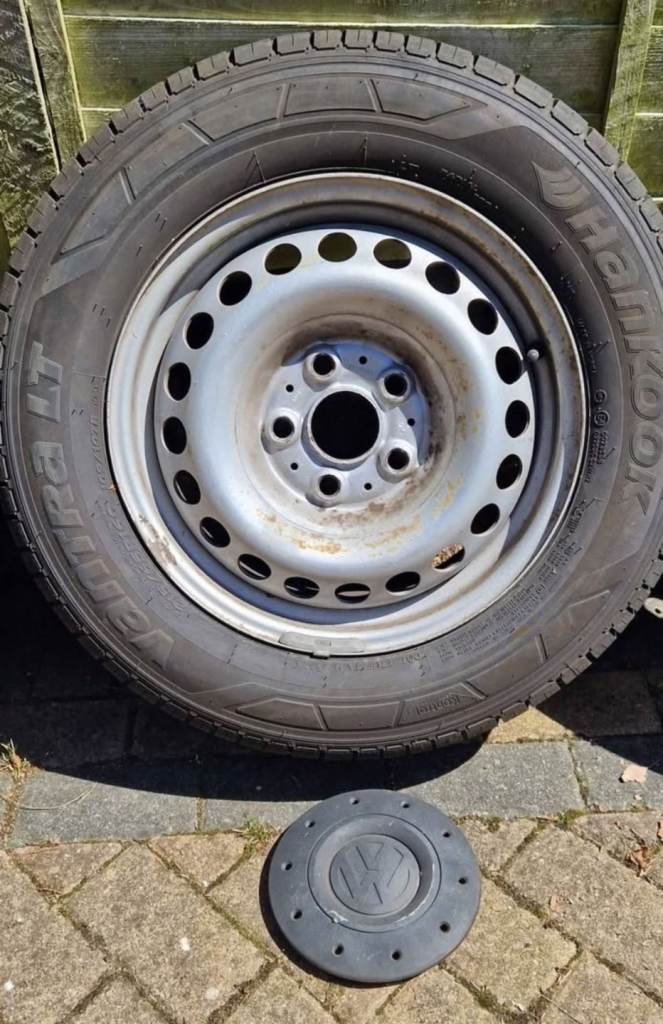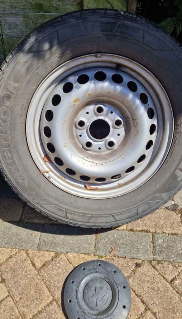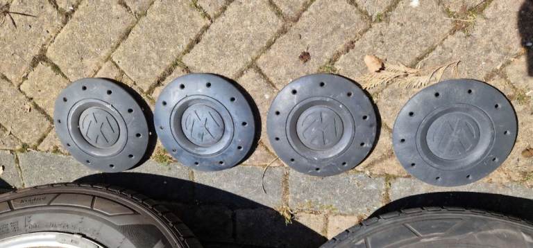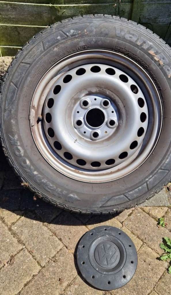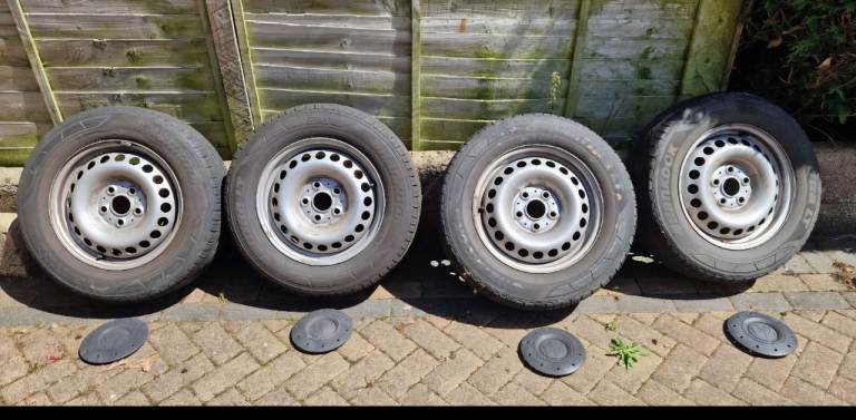 16 inch VW steel wheels with tyres, which all have loads of tread left. Tyre size is 215/65R16C 109/107T. VW inserts also included. These wheels are off a 2007 VW T5. Collection Kingsteignton, or will deliver for cost.