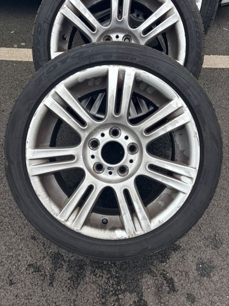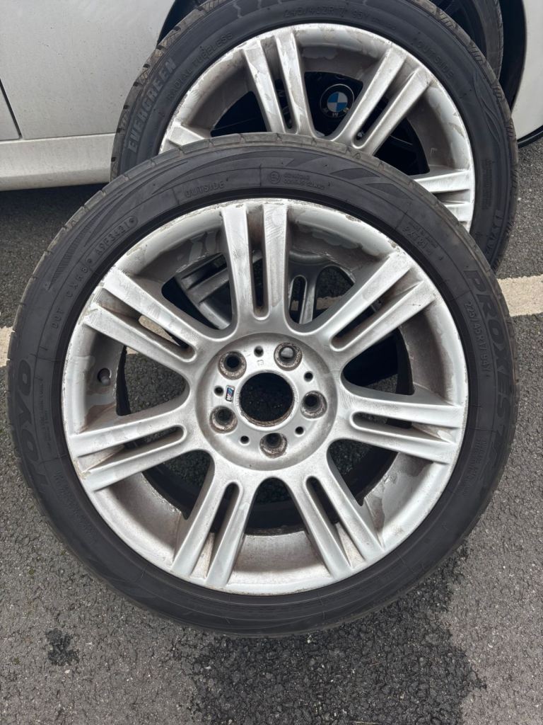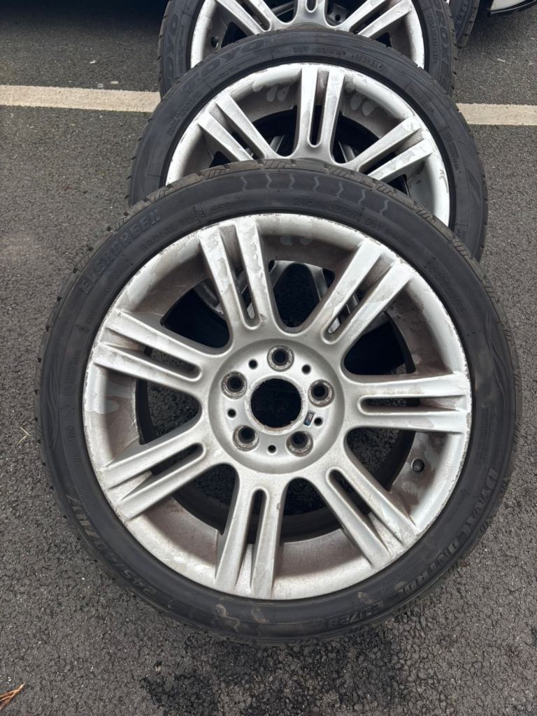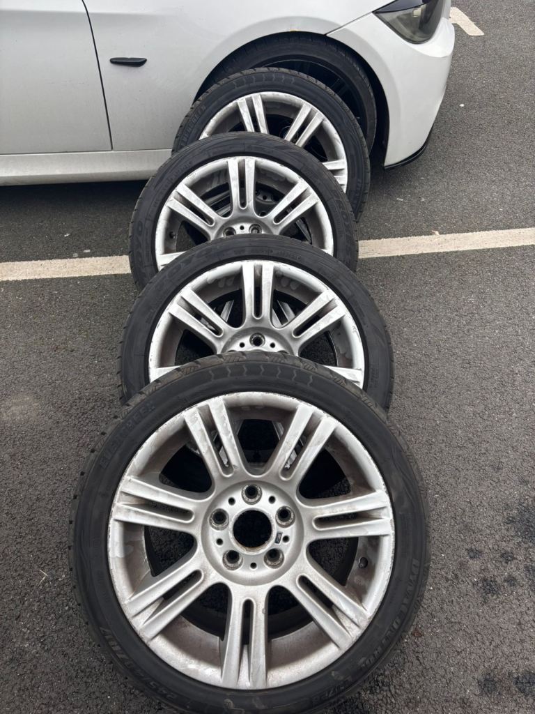 Set of authentic 17 inch BMW alloy wheels in silver, removed from a BMW 3 Series M Sport.