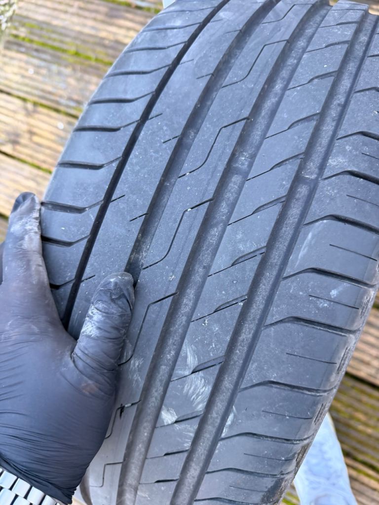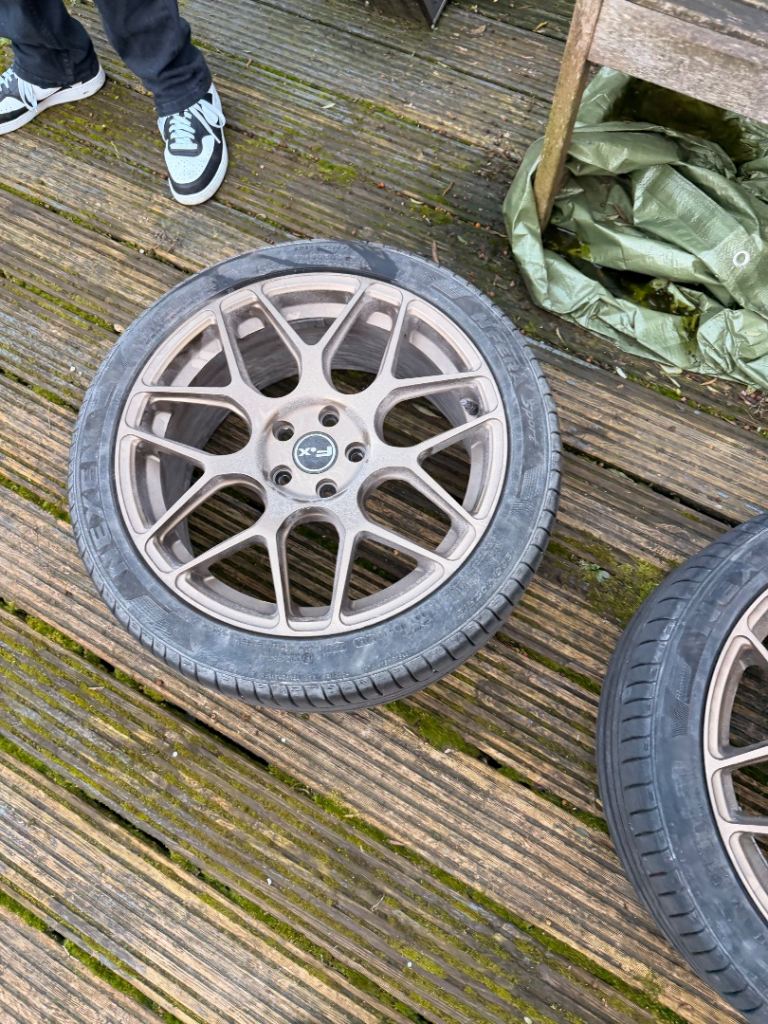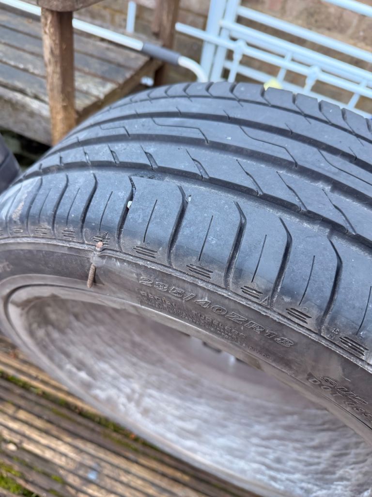 All wheels are in perfect condition with no marks all tyres have like new tread but one tyre has a nail see pics I do have a spare tyre if needed tyre size on wheels are 235/40R18 collection only