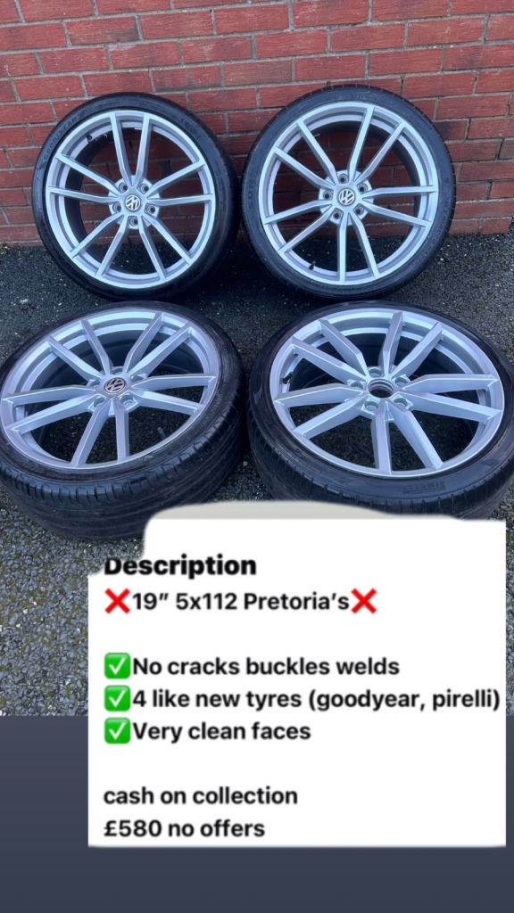 5x112 fitment 19 inch wider rear tyres came from a vw scirocco currently on my s3 audi. Do all have kerb marks no cracks.