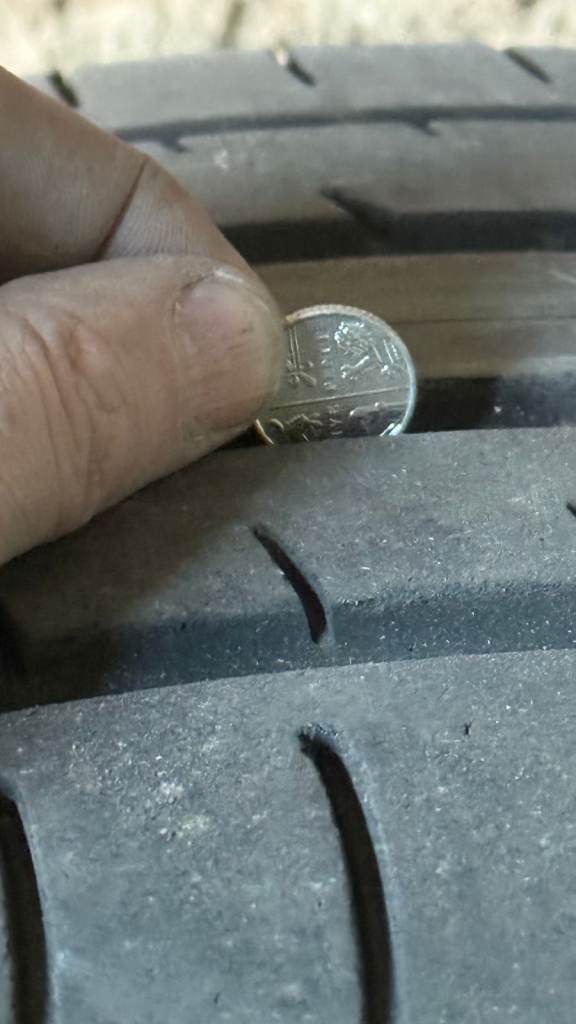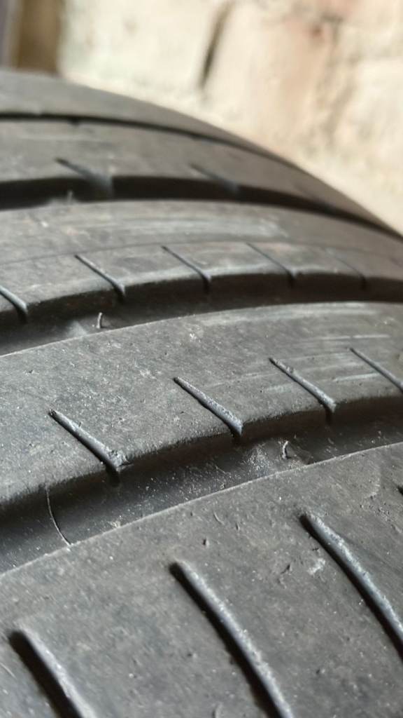 Good condition. No repairs. Removed from an Audi RS5 when I swapped all four tyres. This was too good to discard. Don't know depth, I have no gauge. I would estimate about 5mm, I've put a 5 pence coin in there for scale. The little vertical rubber spikes are still present on the wear markers so lots of life in it.