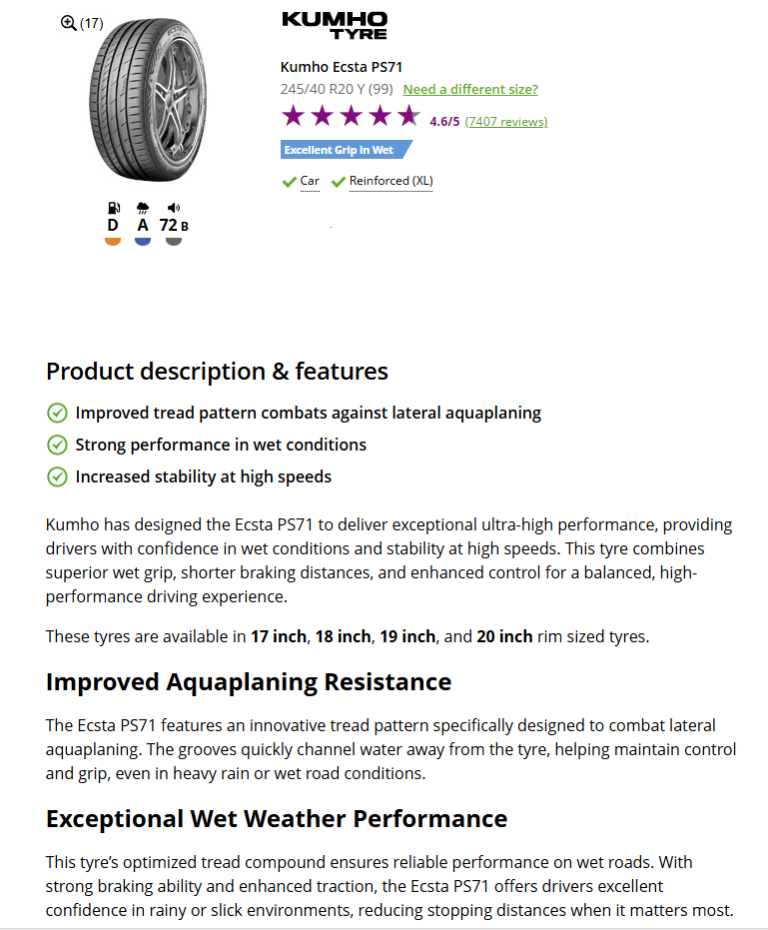 2 off Kumho Ecsta PS71 245/40/R20 W99 tyres, These are XL rated tyres and A rated in the wet.