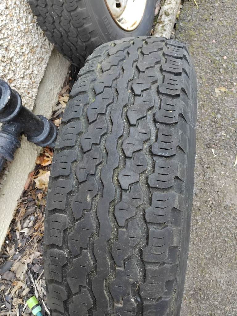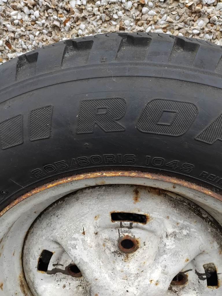 Landrover wheels and tyres size 205/80R16 good tread both holding air surplus to requirements surface rust only a good wire brush, paint come up like new will sell individually thanks