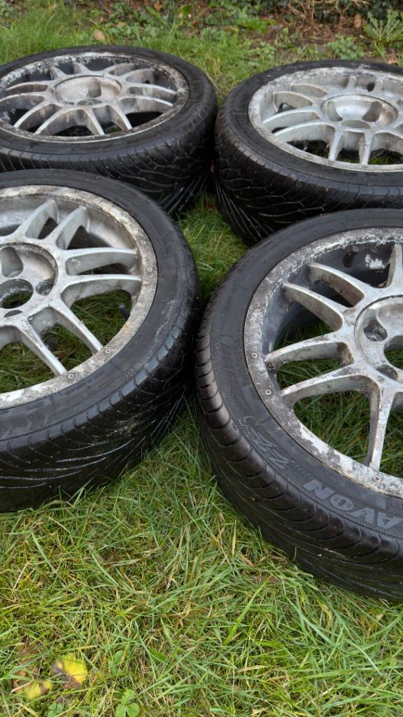 These are track day alloy wheels with tyres - they are in need of refurbishing - if you have any questions, please send me a message.