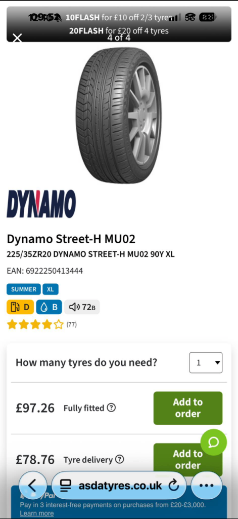 Two matching tyres 225 35 20. Was brand new but done less than 200 miles. Taken off as I needed to cover more alloy. Brand new they are the same price for one. The price is for both not singles