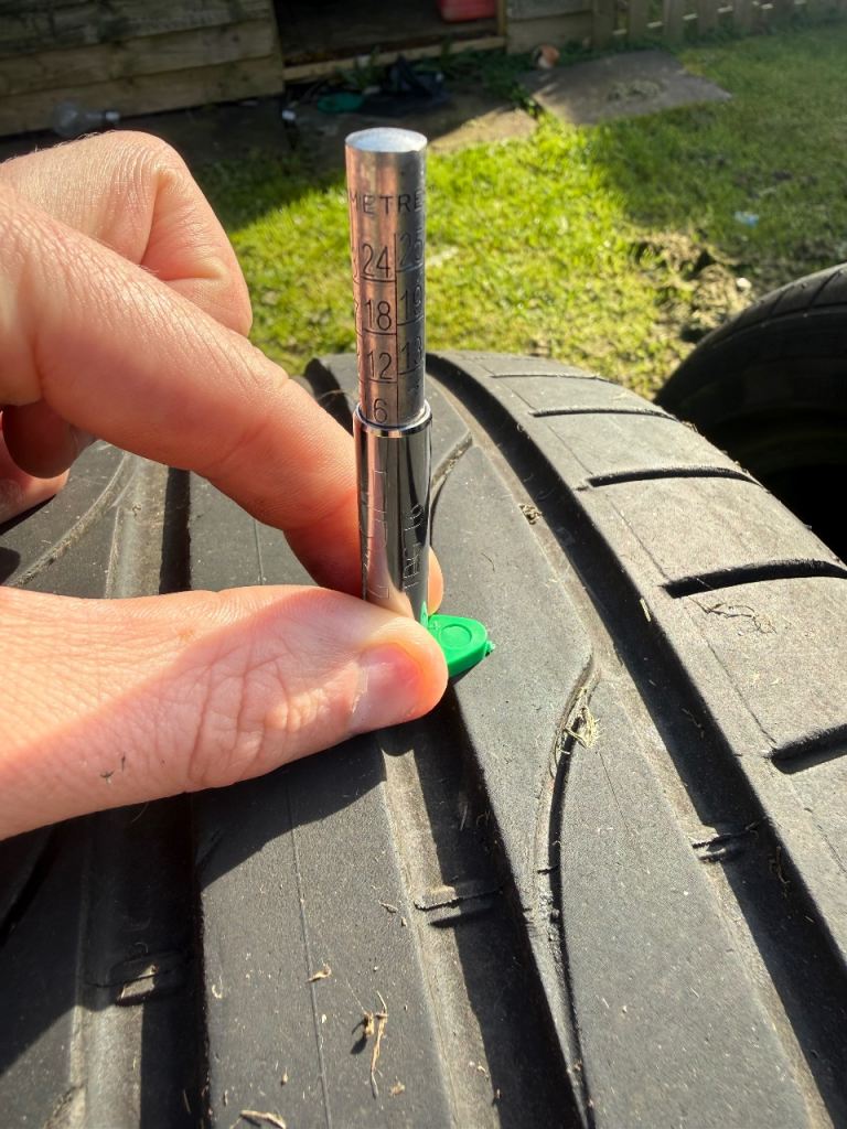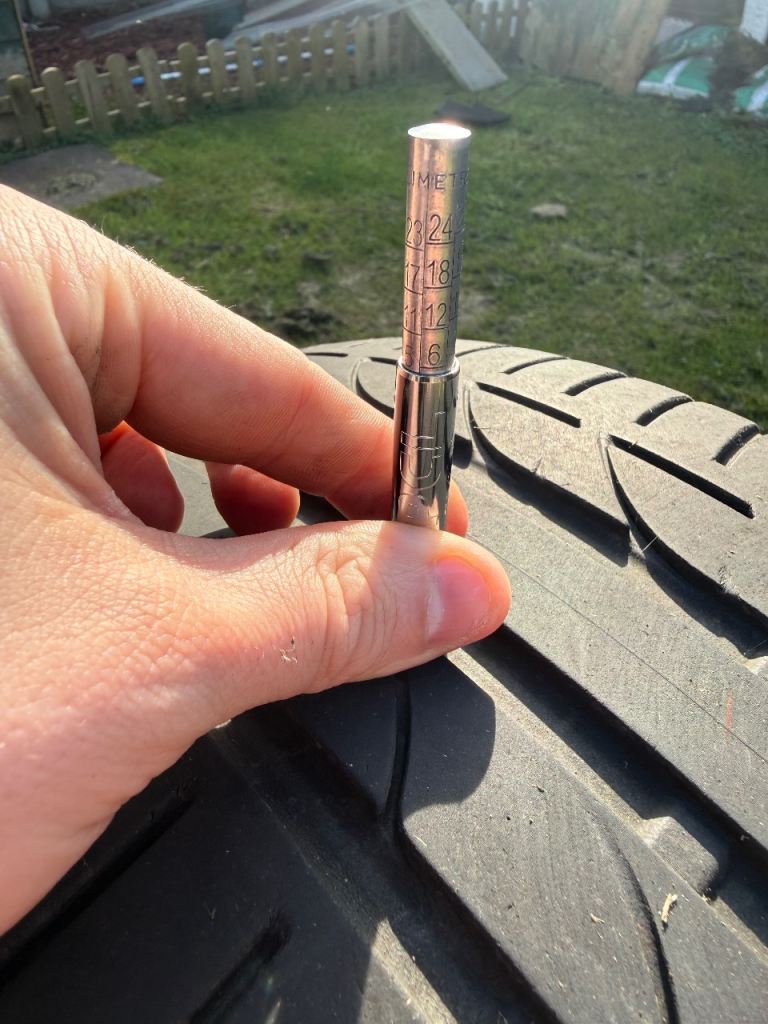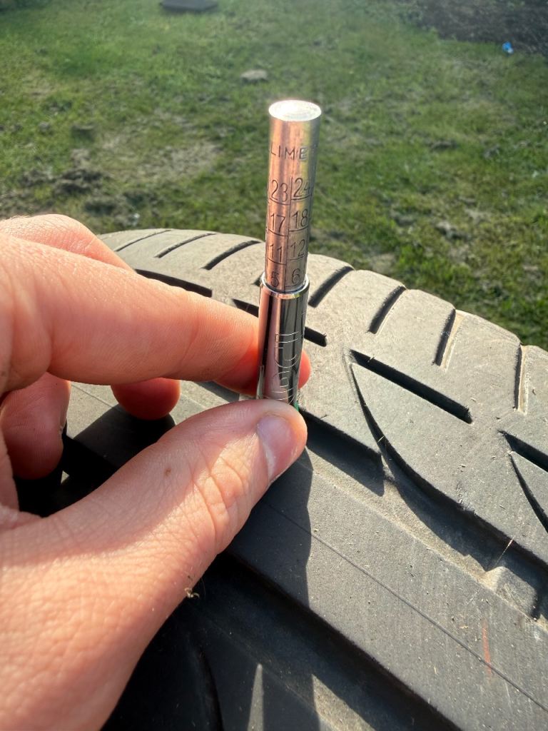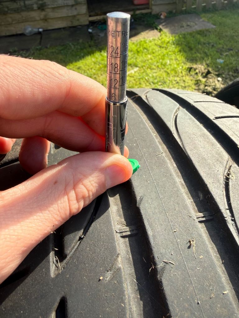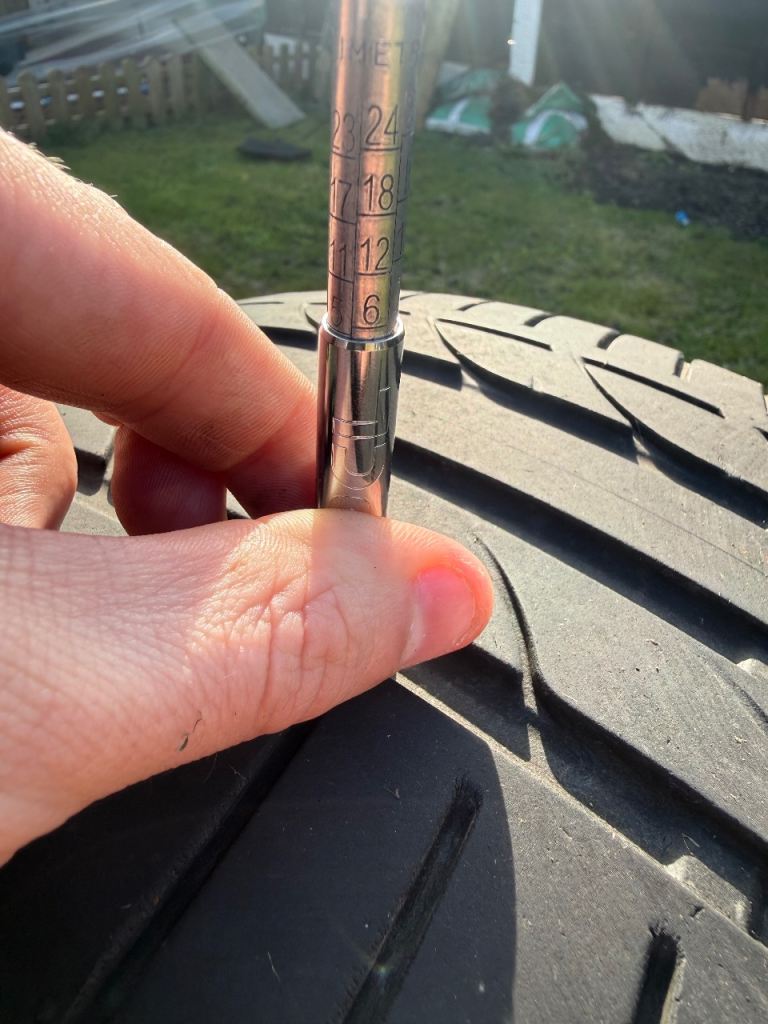Tyre on the left has 6mm of tread on centre, left and right tread lines.