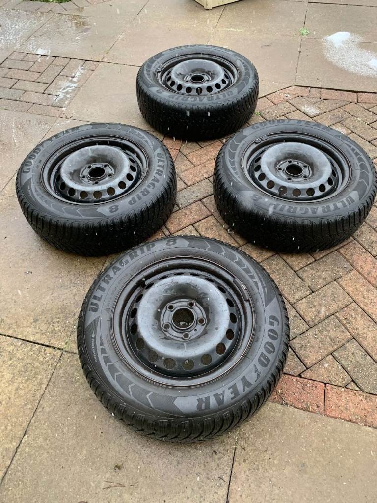FOUR Goodyear Ultragrip 8 tyres - M+S 205/65R15 94T- with four wheels and four (plus one spare) plastic wheel trims. Were used as winter tyres for a SAAB 93 . In good condition, no uneven wear and no leakage of air.