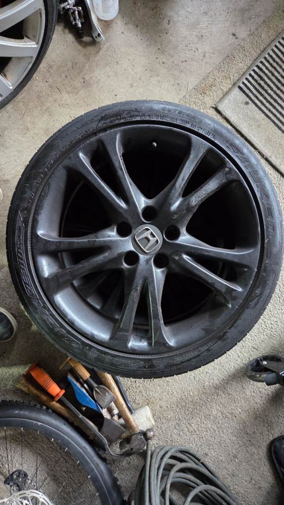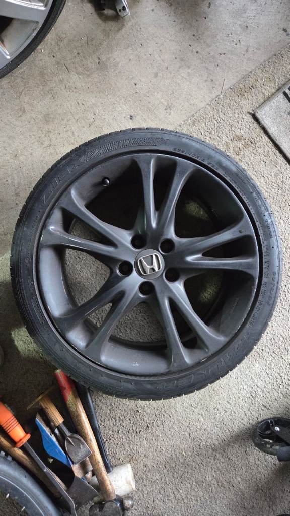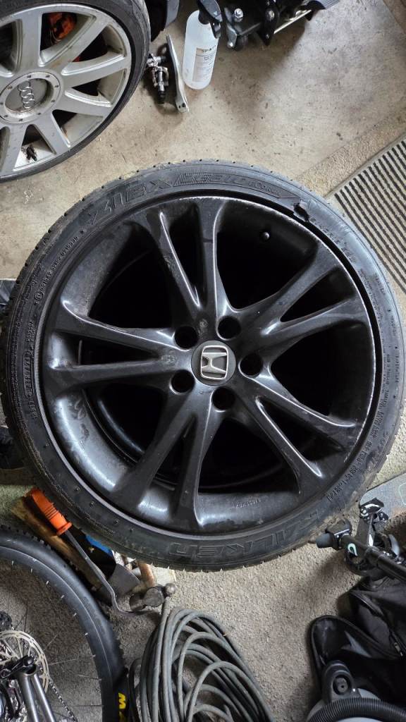 Set of 4 18 inch alloy wheels, spray painted black, not particularly well!!! Came off my Mk9 Honda Civic but may fit other models. 4 matching Falken tyres with usable tread, 1 tyre has damage to sidewall, still holds air but would probably fail MOT