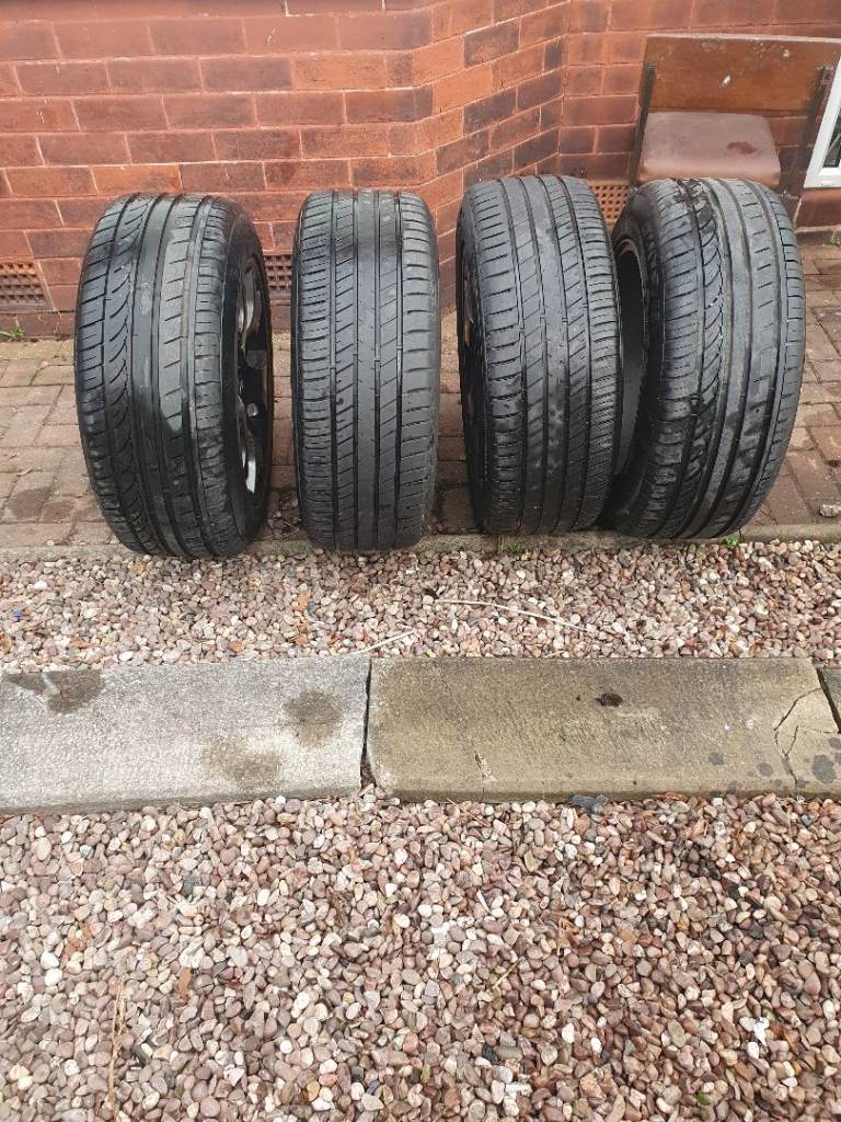 4x 19in alloys.. came off vw t5 transporter .. may fit landrover..rangerover audi.. bmw c/w good heavy duty tyres .. tyres cost over £100 each last year . plenty of tread 4m/m . alloys sound not broken or bent .. need a tidy up on rims.. can deliver manchester area.. heavy for me to lift, i got lighter/smaller wheel