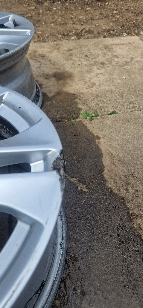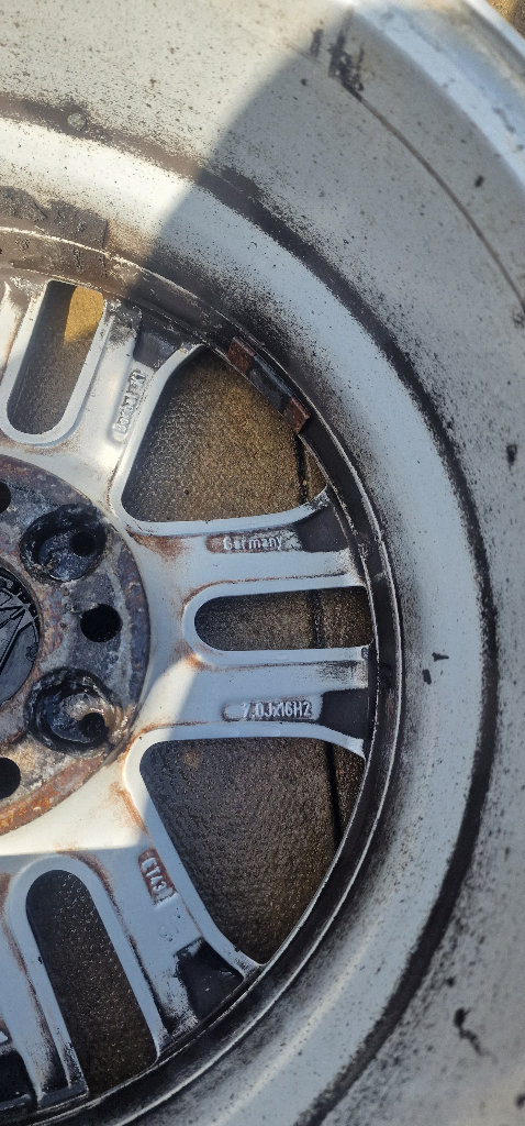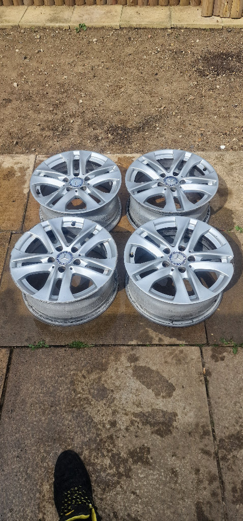 Used 2014 Mercedes genuine alloys .Size 16 7.0J ET43, 5x112. All 4 hold air. Has kerb scratches. never welding or repair.