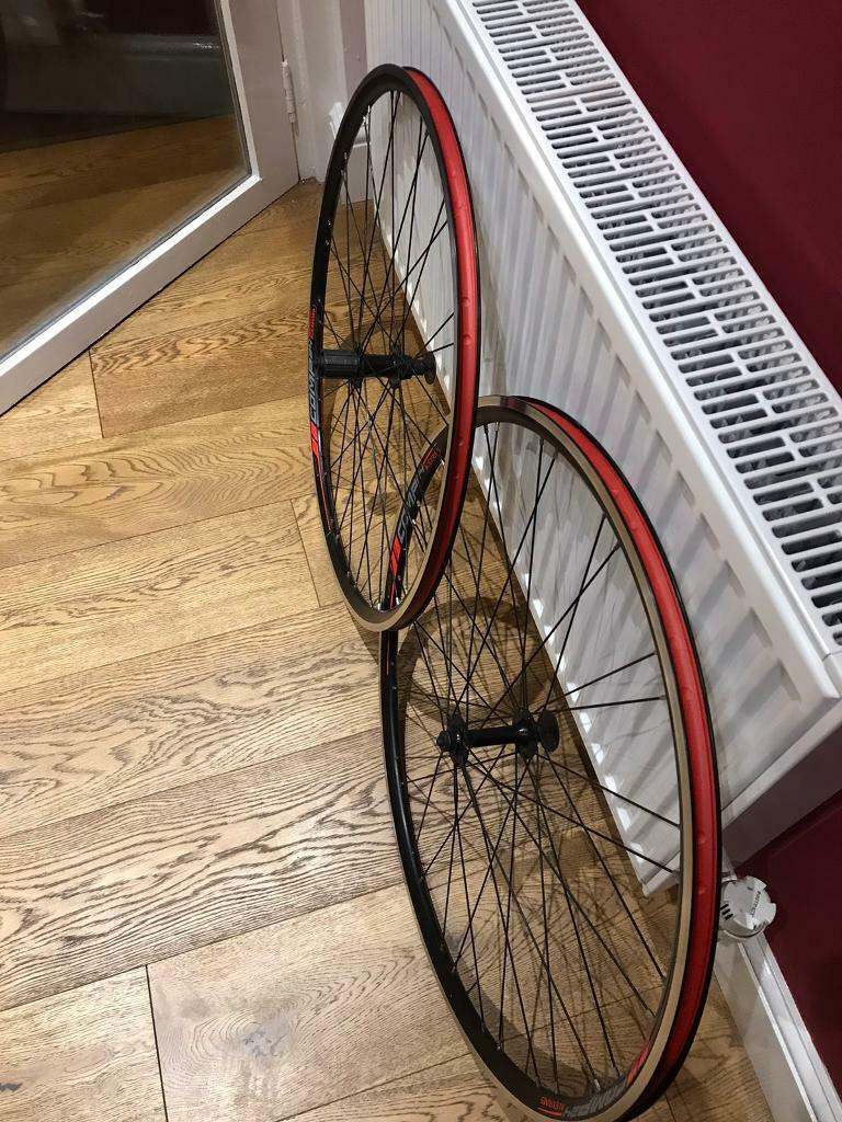 Excellent condition both run true with no defects , rim brakes only , shimano 10-11 speed free hub, very nice light set of wheels with hardly any wear, pick up but could post £10