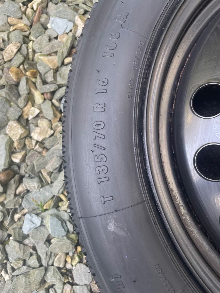Alfa Romeo 16” space saver wheel. From a mito but will suit many others continental tyre 135/70-16” fully inflated ready. 4 x 98pcd with a 58.1mm centre bore. Suit many alfas and fiat models. Collection from wa13 area