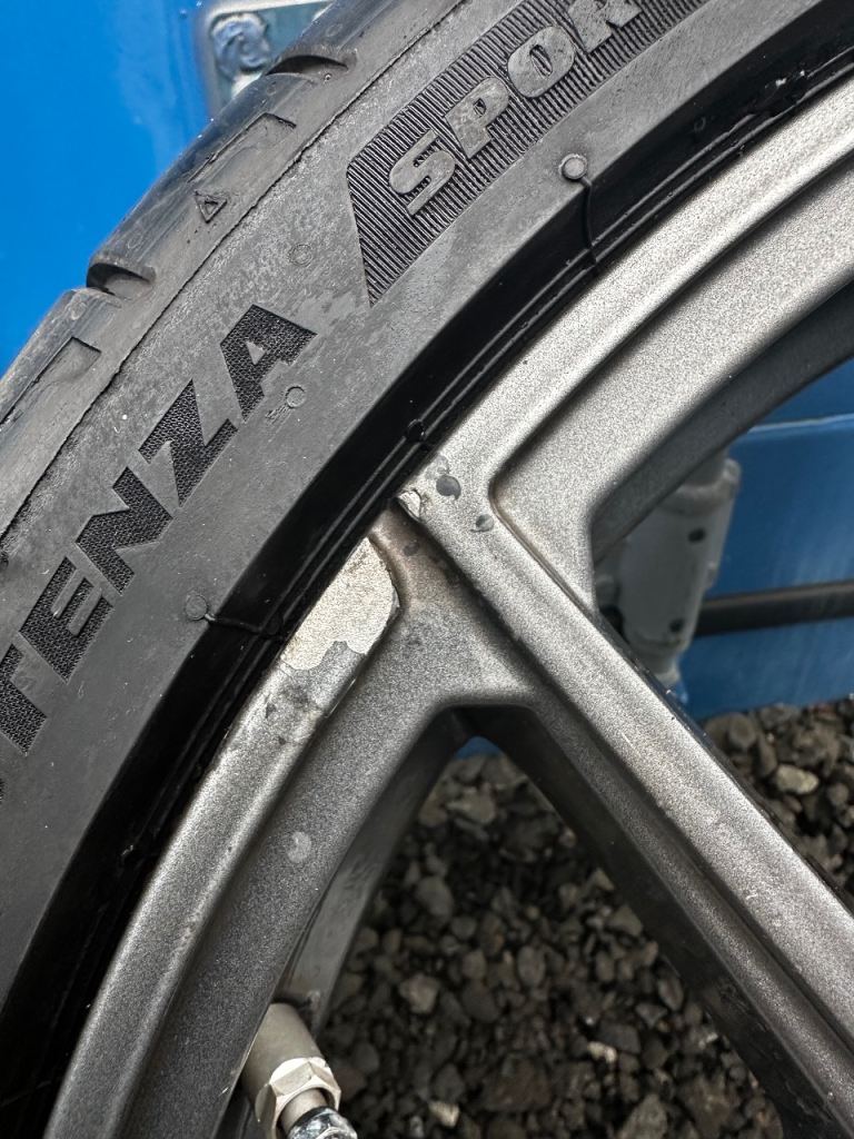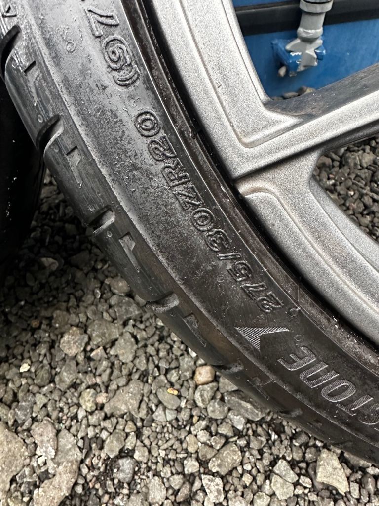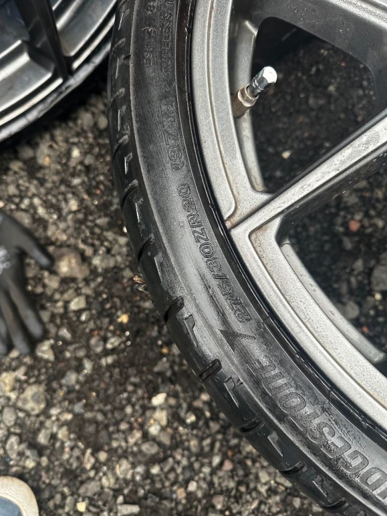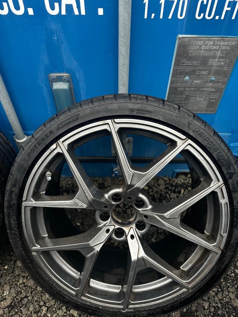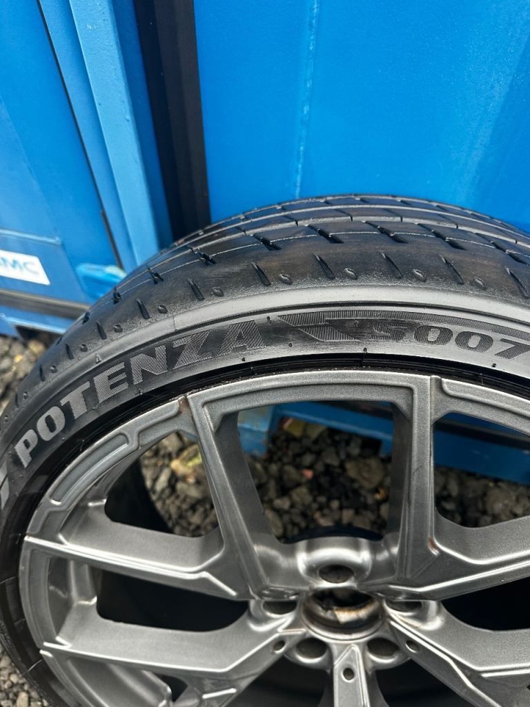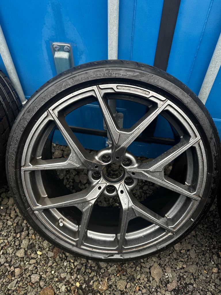 After market alloys 20in, came off a merc c220. Bridgestone Potenza sport on the back and Bridgestone Potenza S007 on the front. Staggered 245/35/20, 275/35/20 front tyres have about 3-4 mm tread and rears are practically new with 5-6mm They were diamond cut originally and then powder coated. The coating is flaking in places on all wheels and 1 front has small kerb damage as in the pictures