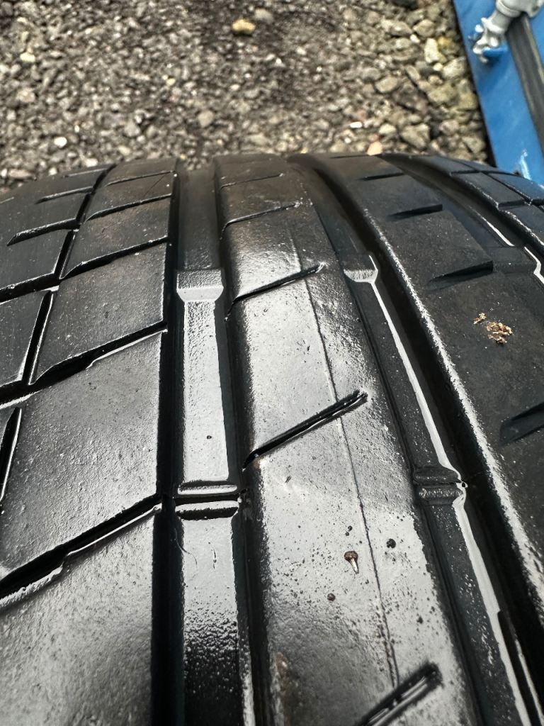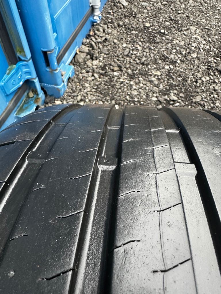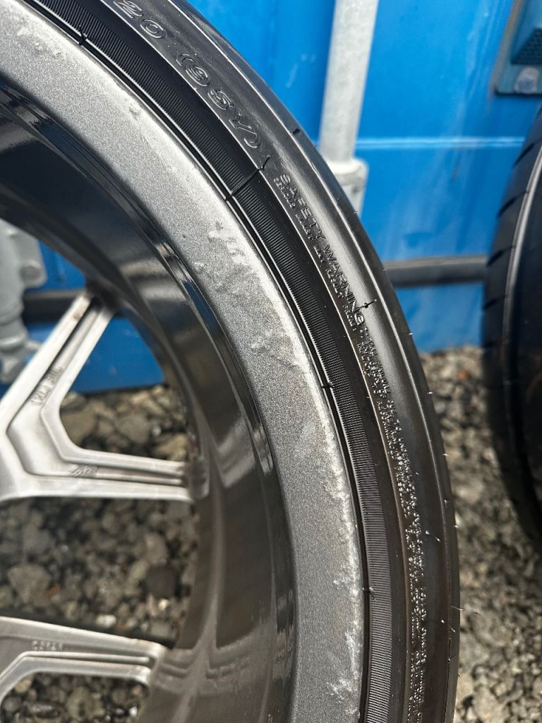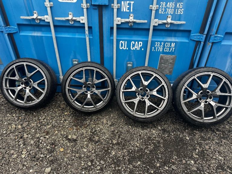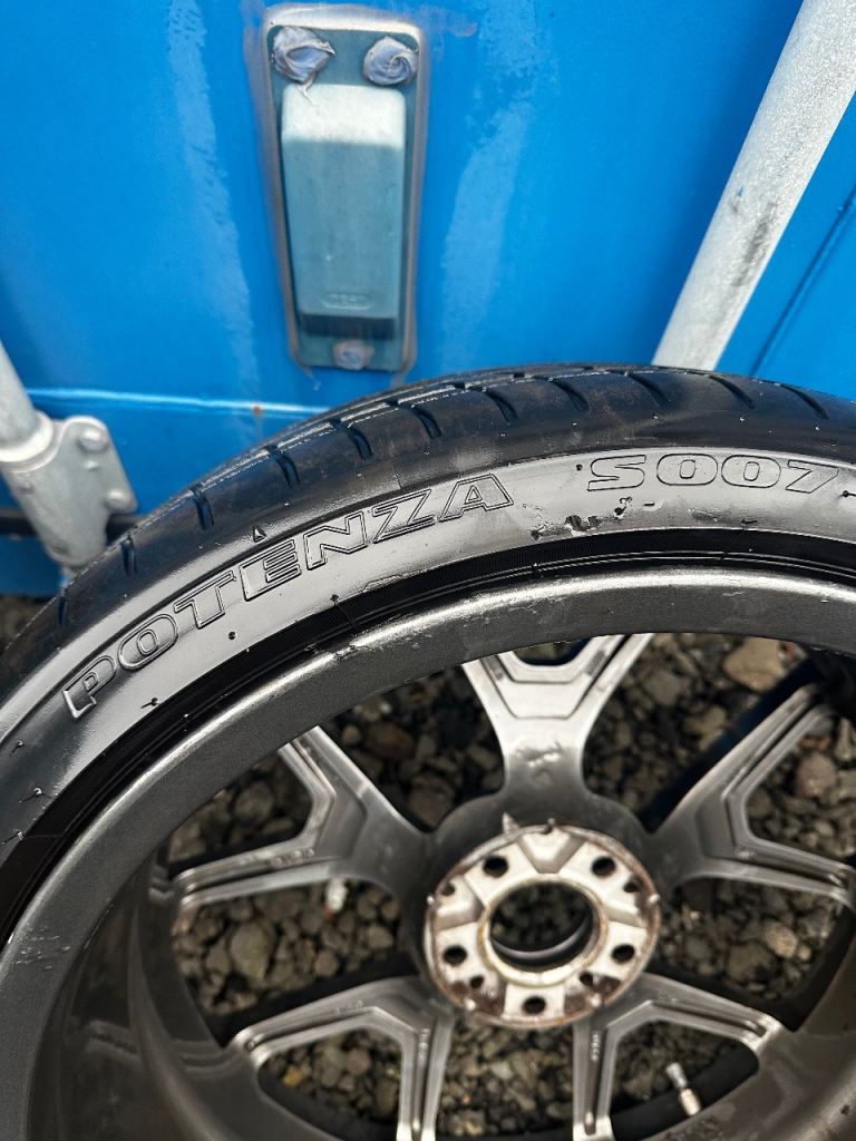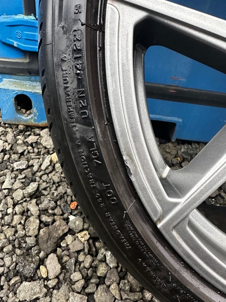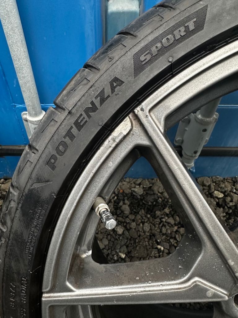 After market alloys 20in, came off a merc c220. Bridgestone Potenza sport on the back and Bridgestone Potenza S007 on the front. Staggered 245/35/20, 275/35/20 front tyres have about 3-4 mm tread and rears are practically new with 5-6mm They were diamond cut originally and then powder coated. The coating is flaking in places on all wheels and 1 front has small kerb damage as in the pictures