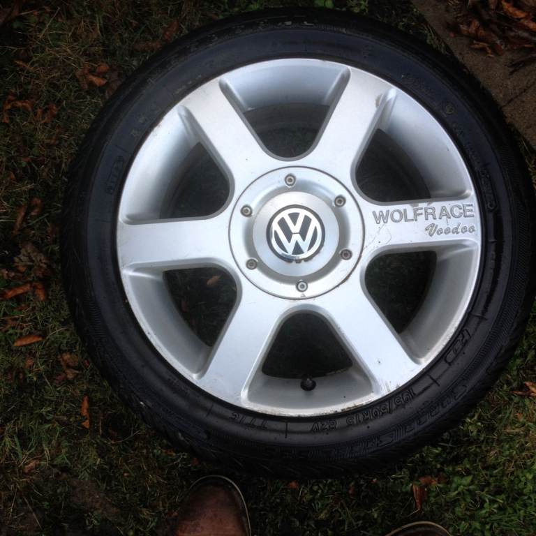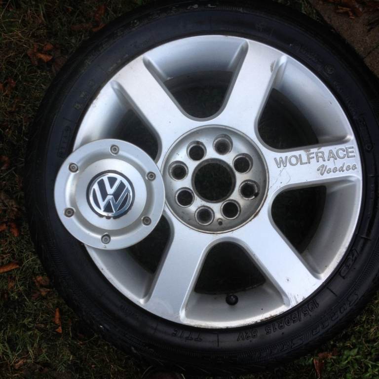 Two sets of Alloy wheels. The first is a set of x 4 Vauxhall alloys with a fifth ( steel ) wheel as a spare. 195 65 R15 - all treads are very good £100. The second is a set of x 4 Wolf race alloys multi fit (fits VW) with VW centre plates. Two tyres have a lot of tread, one has a little and one needs changing. £90.