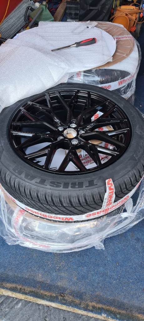 19 inch black alloy wheels 5x108 with 235/50 zr19 tyres less than a year old, all tyres have 7mm tread.