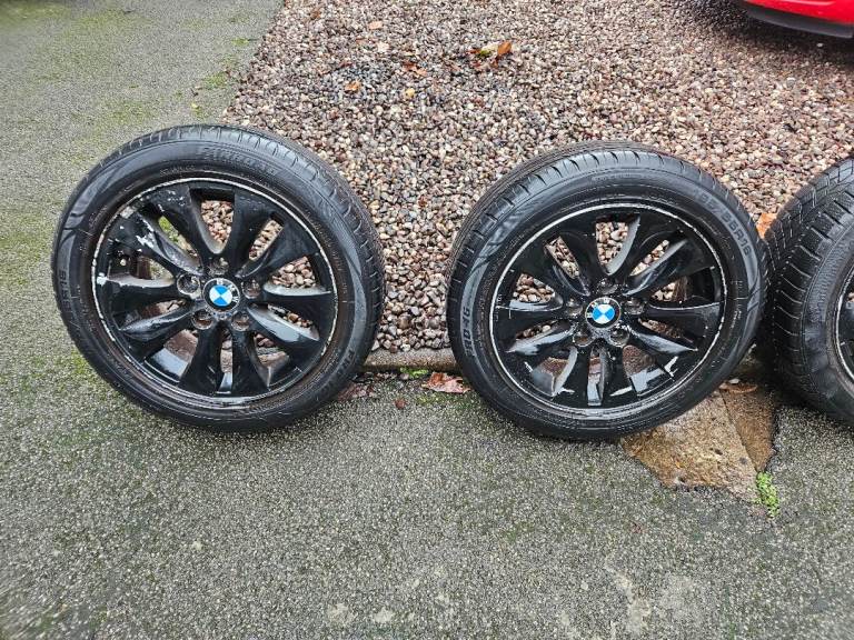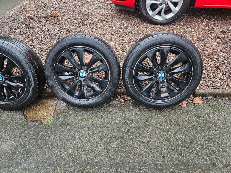 Bmw 16in alloy wheels and tyres set of 4 pcd120 fitment 5 stud no welds cracks or buckles few minor marks and some curb rash on outer edges tyres legal £120 the set collection only from coseley Bilston west midlands