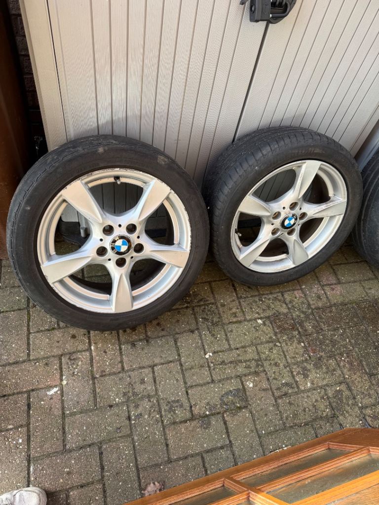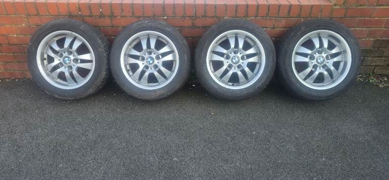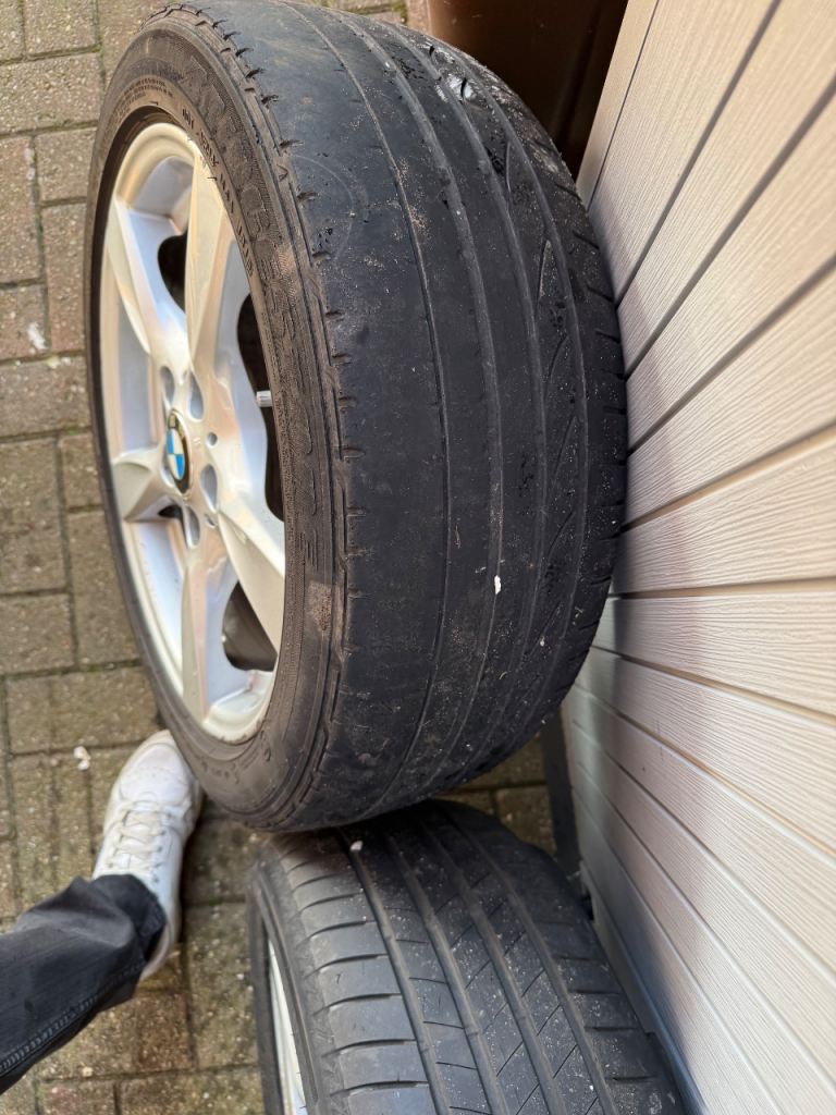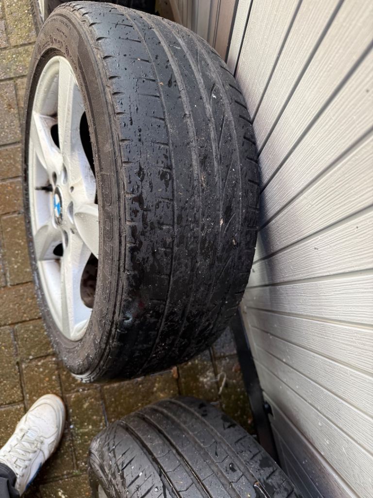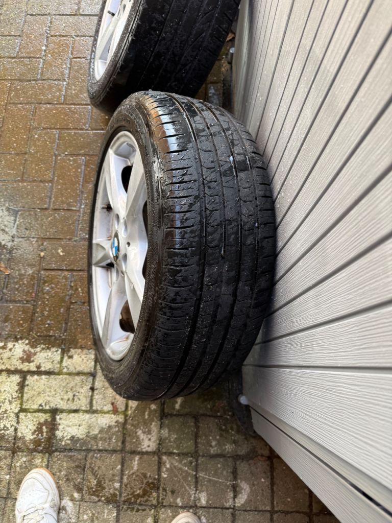 17 inch BMW Alloys in good condition no major scuffs,tyres not great one is blown, one good thread but alloys are good a refurb be make them excellent. Tyre size is 205 50 17