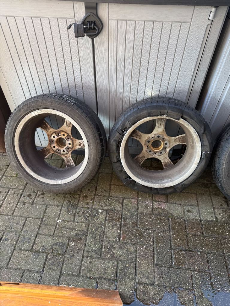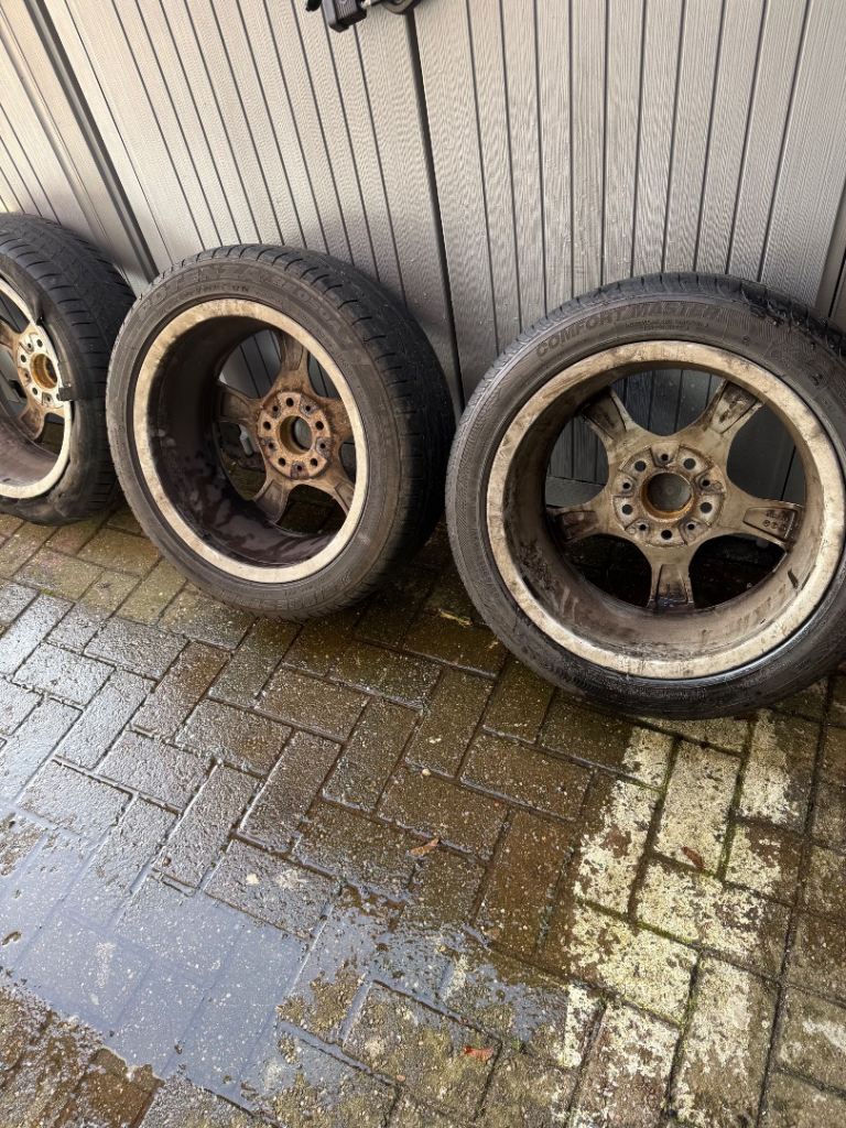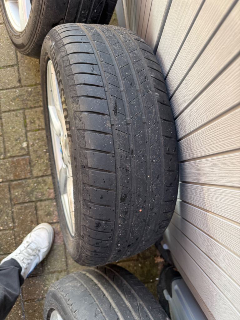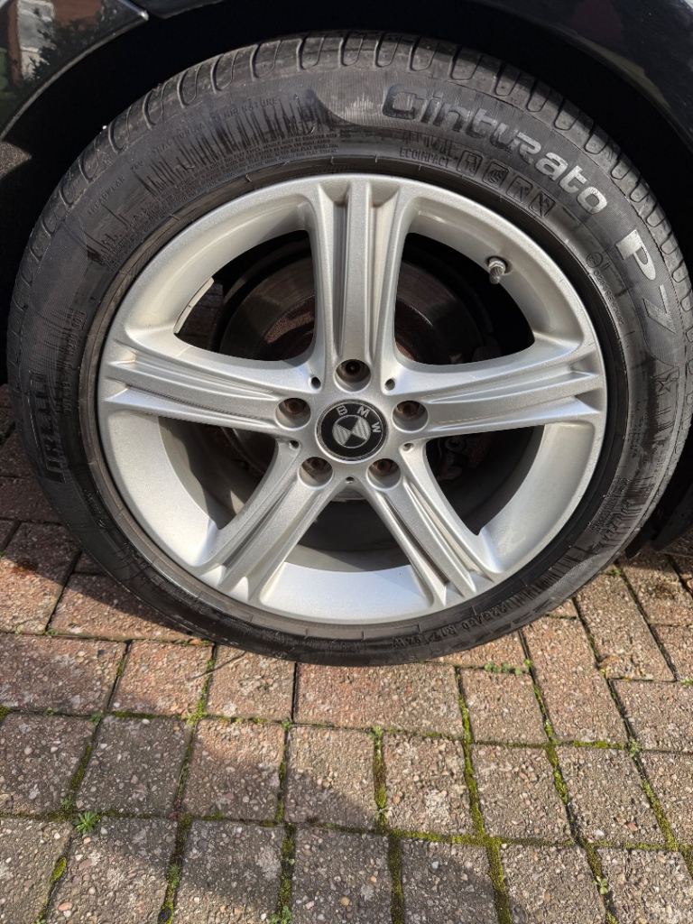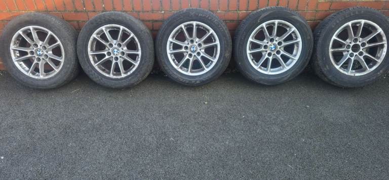 17 inch BMW Alloys in good condition no major scuffs,tyres not great one is blown, one good thread but alloys are good a refurb be make them excellent. Tyre size is 205 50 17