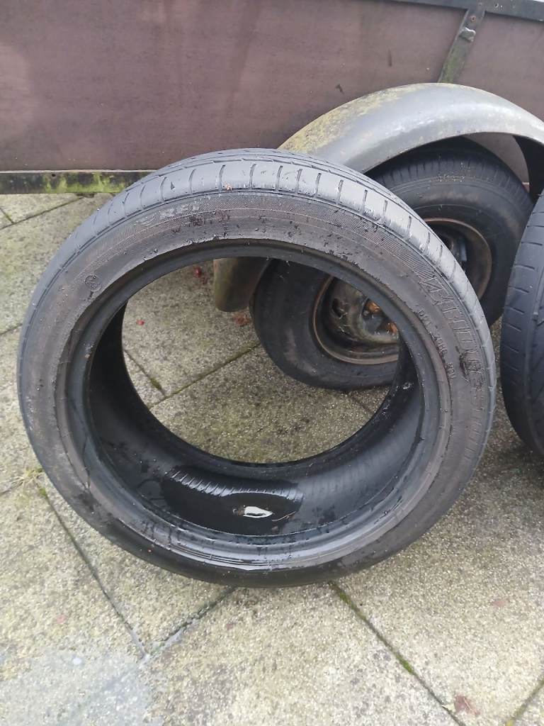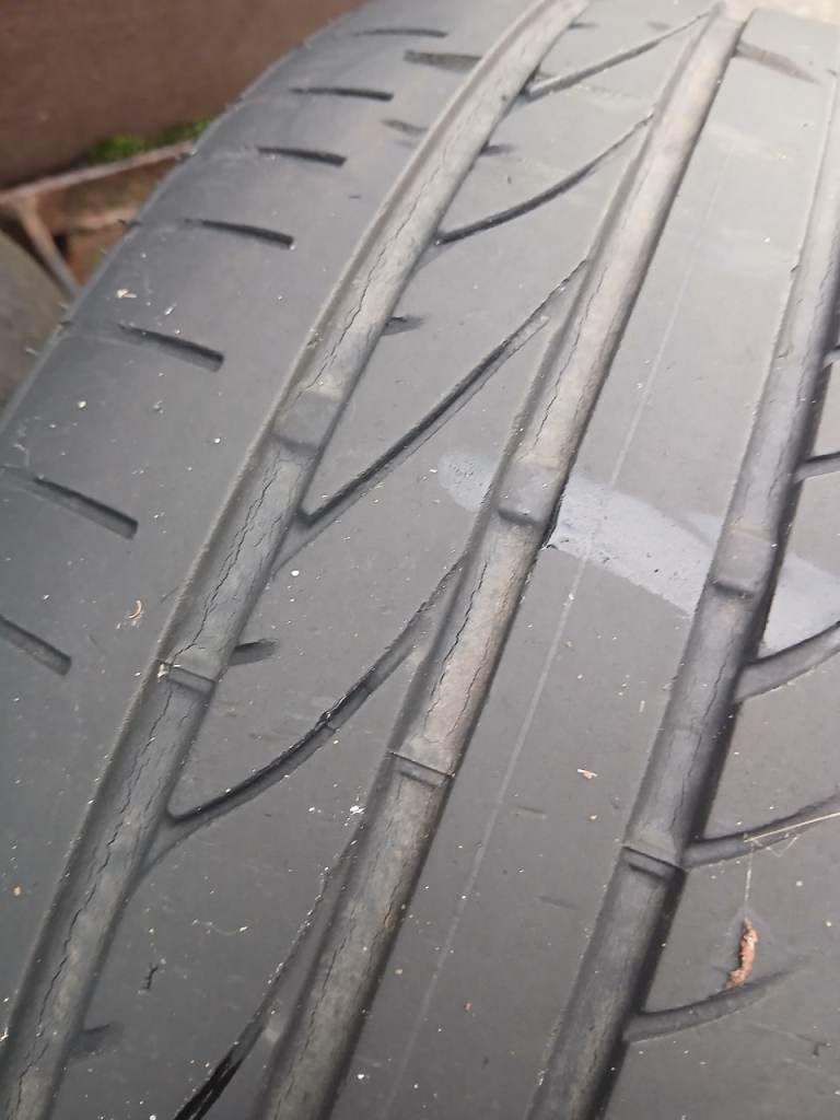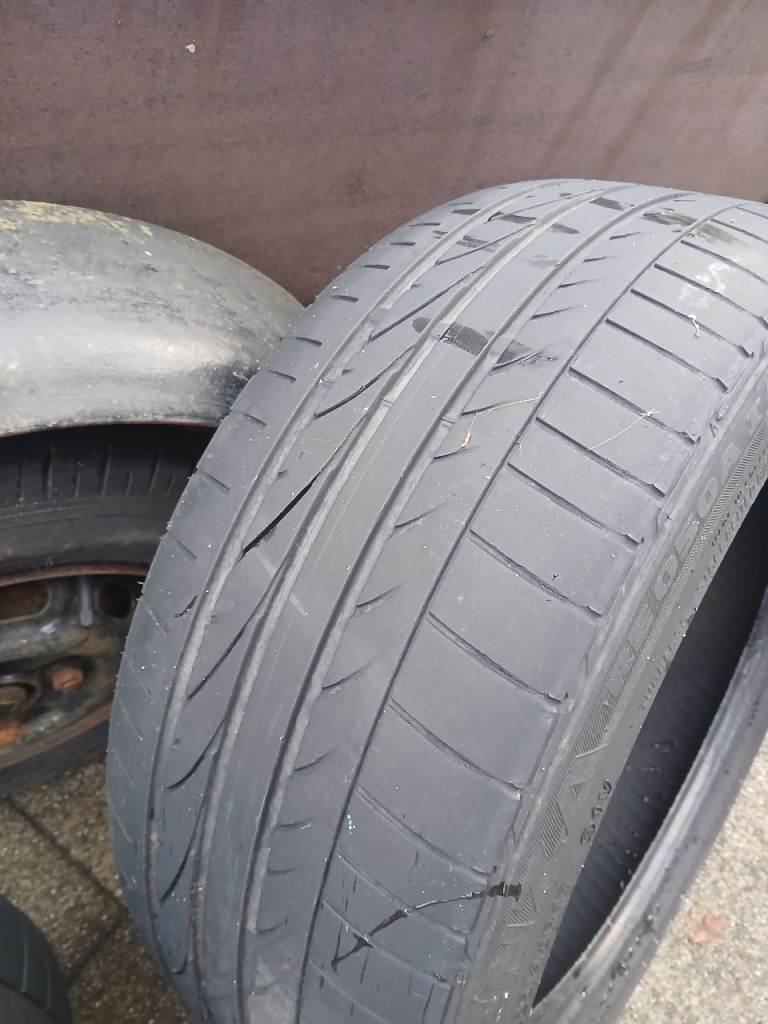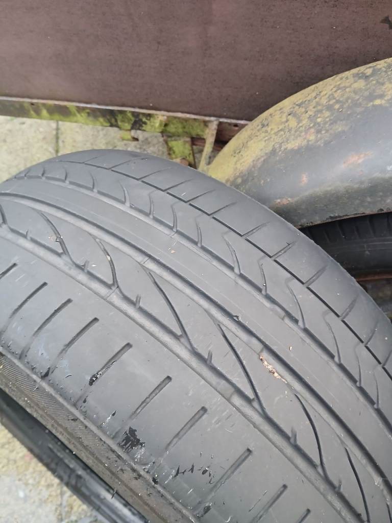 A pair of Bridgestone Potenza RE050A tyres with approx 4.5mm tread on both, size 225/45/17.