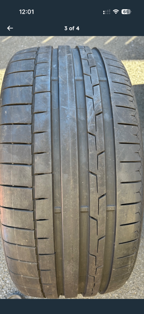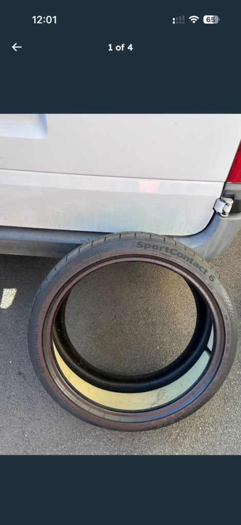For sale I have a part worn continental sport contact 6 reduced road noise with foam lining . Very good condition no punctures or wall damage.