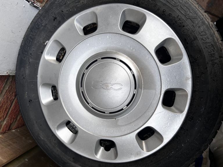 Fiat 500 steel rims with tyres & wheel trims x4, two brand new tyres just fitted 175/65/14” two good used tyres. See photos. Trims in good condition genuine silver fiat 500. Collection only. Call for any info