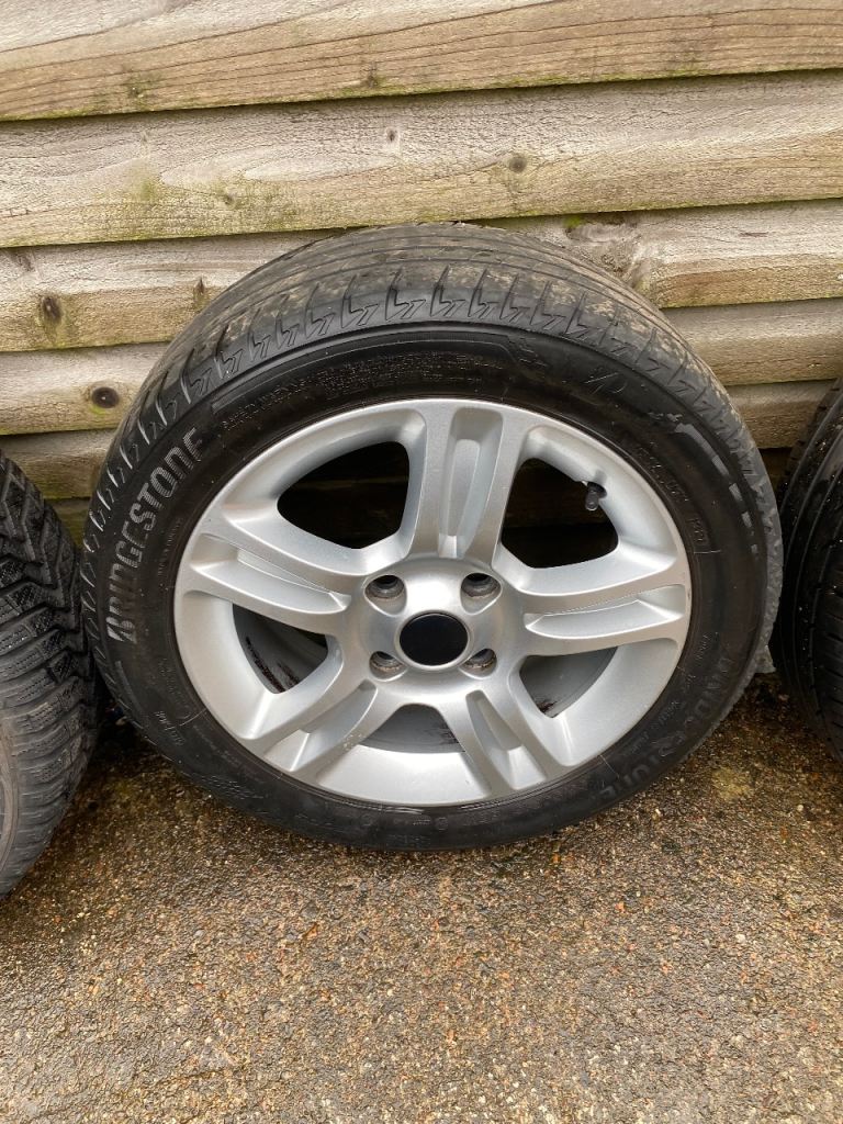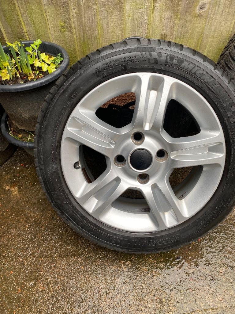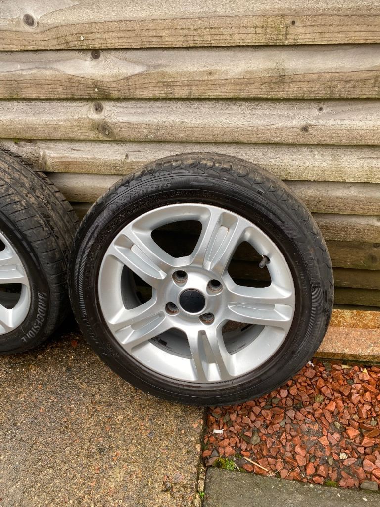 Set of 4 alloy wheels for fiesta or ka,4 stud fitting, bought recently to fit then changed my mind, all tyres have good tread, couple of scuff marks