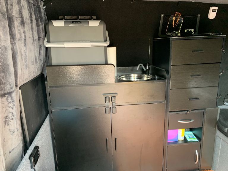 Sink with hand pump, 20L clean water and waste collection.