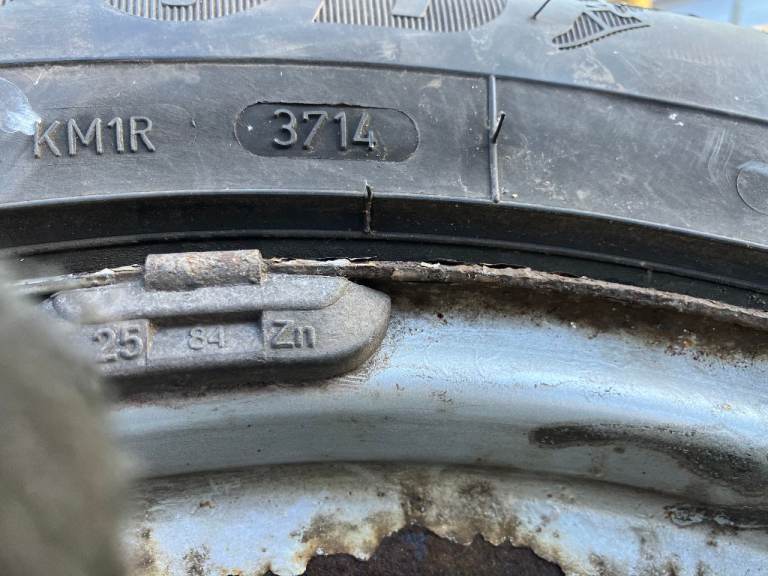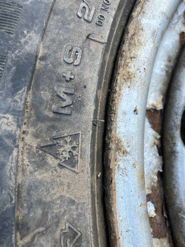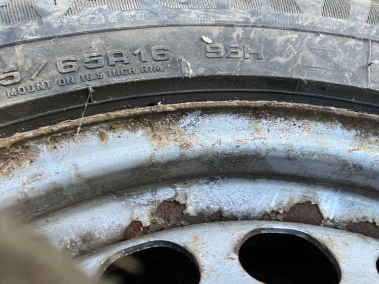 The steel wheels are pretty scabby but solid. The tyres have about half tread left and tread is evenly worn across all tyres. There are no plugs or punctures. Not used April through November.