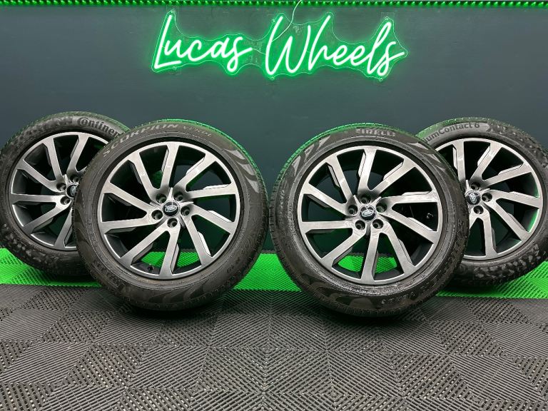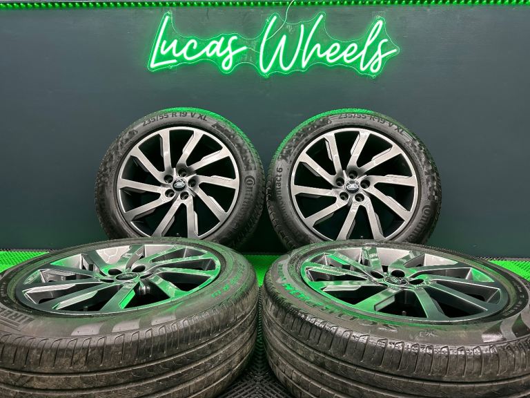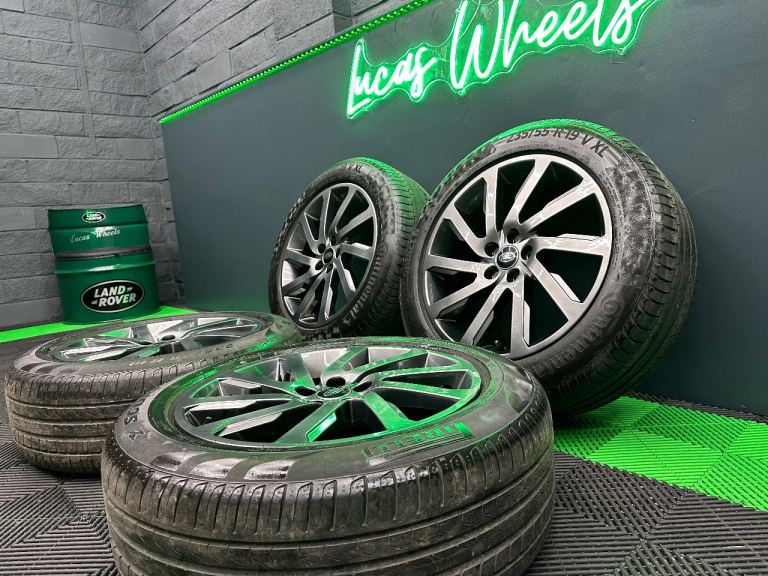 Lucas Wheels presents a rare listing that would make for a fantastic upgrade for any Freelander 2! A full set of Freelander 2 Dynamic 19 inch alloy wheels that we have powder coated in shadow chrome! Complete with premium matching per axle 5mm+ tyres and new black / green Land Rover centre caps too 👍