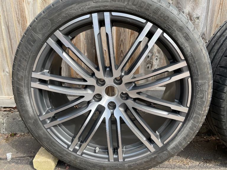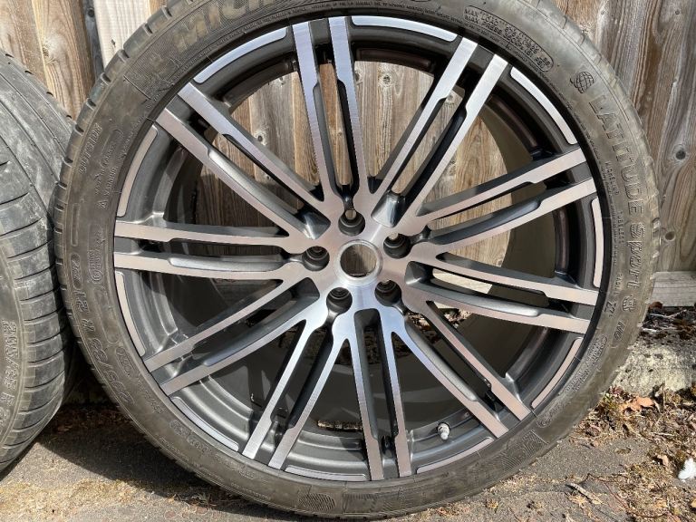 Genuine Porsche Macan 21 Turbo Alloys for sale. From a 2014 car. Not used since re-cut, so near good-as-new condition. Michelin Latitude Sport tyres. The two rears have 3-4mm tread left as does one of the fronts. The other front has 6mm tread. Has tpms valves but no centre caps (have ones any buyer is welcome to have but they are a bit tired looking). Collection in Edinburgh or buyer to arrange courier. Selling for £2,500. Msg with any questions.