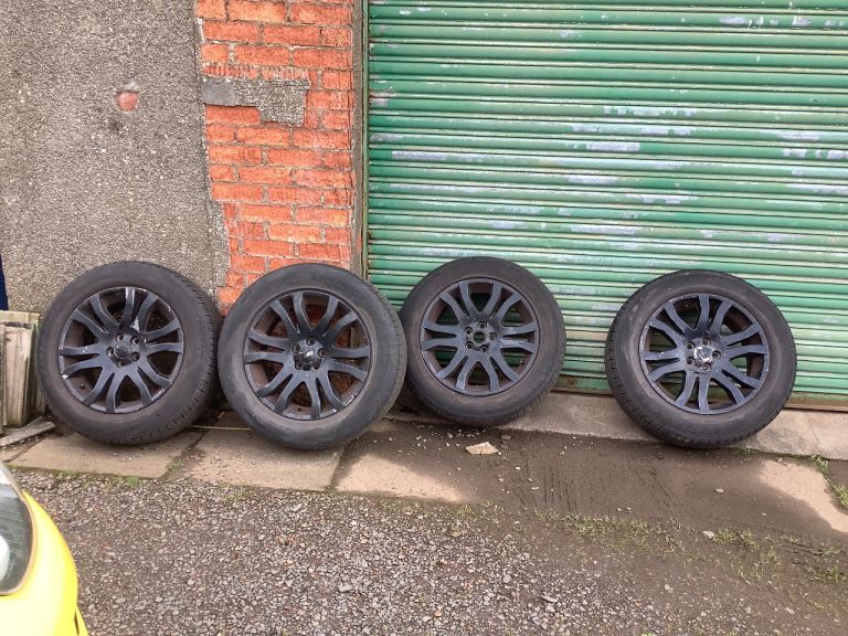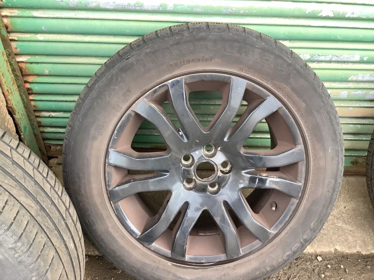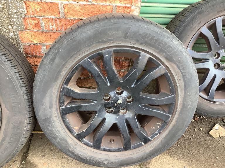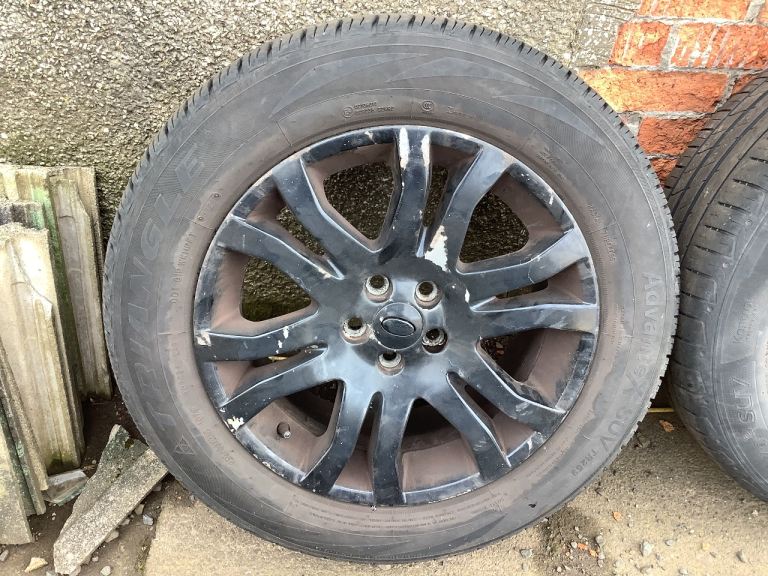 Set of standard Freelander 2 wheels and 235/60 R18 tyres. The wheels are in decent condition however someone has painted them black at some point and the paint is now flaking off in areas. Two of the tyres are in good condition with around 5mm of tread, one has between 3 & 4mm and the last has 3mm tread. I have only just removed these from my car and replaced them with new wheels. No leaks and no vibrations.