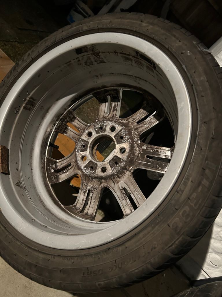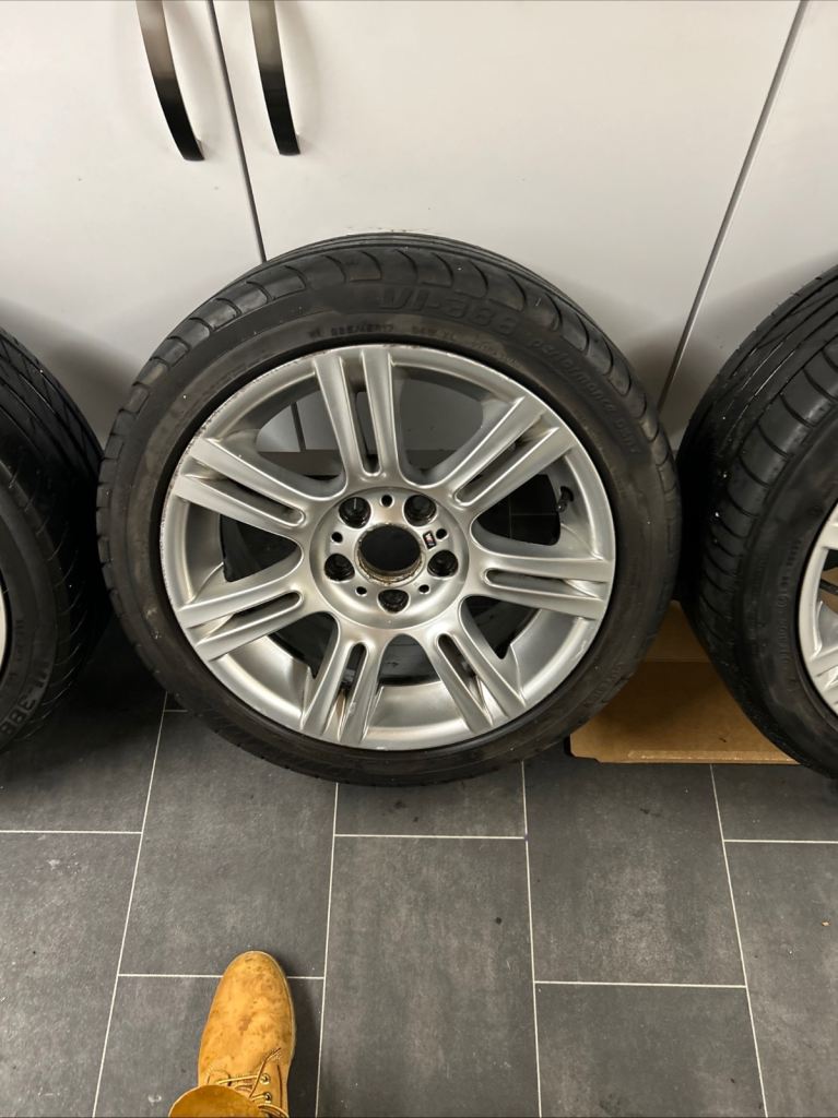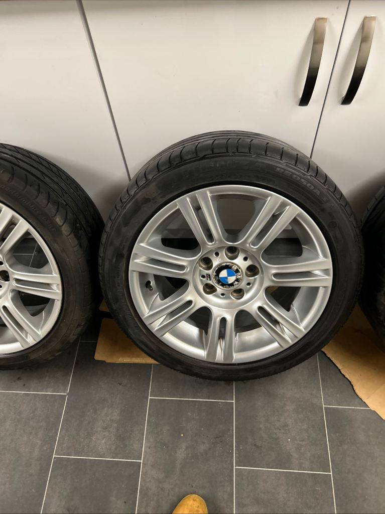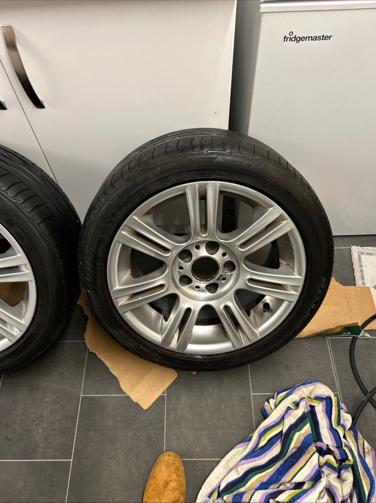 17” m sport alloys with run flats on good tyres on front rears a bit more worn wider rears