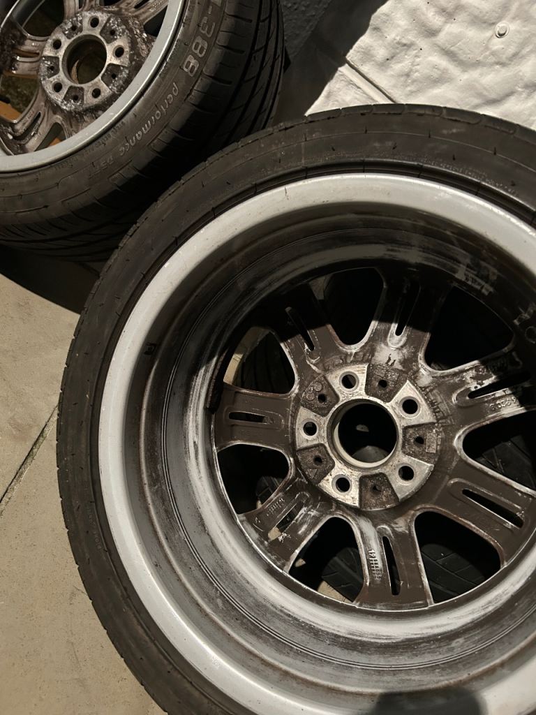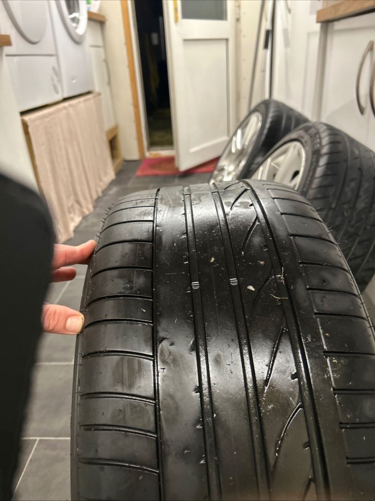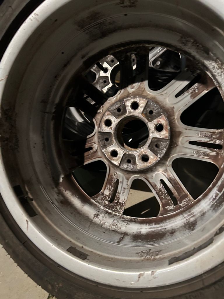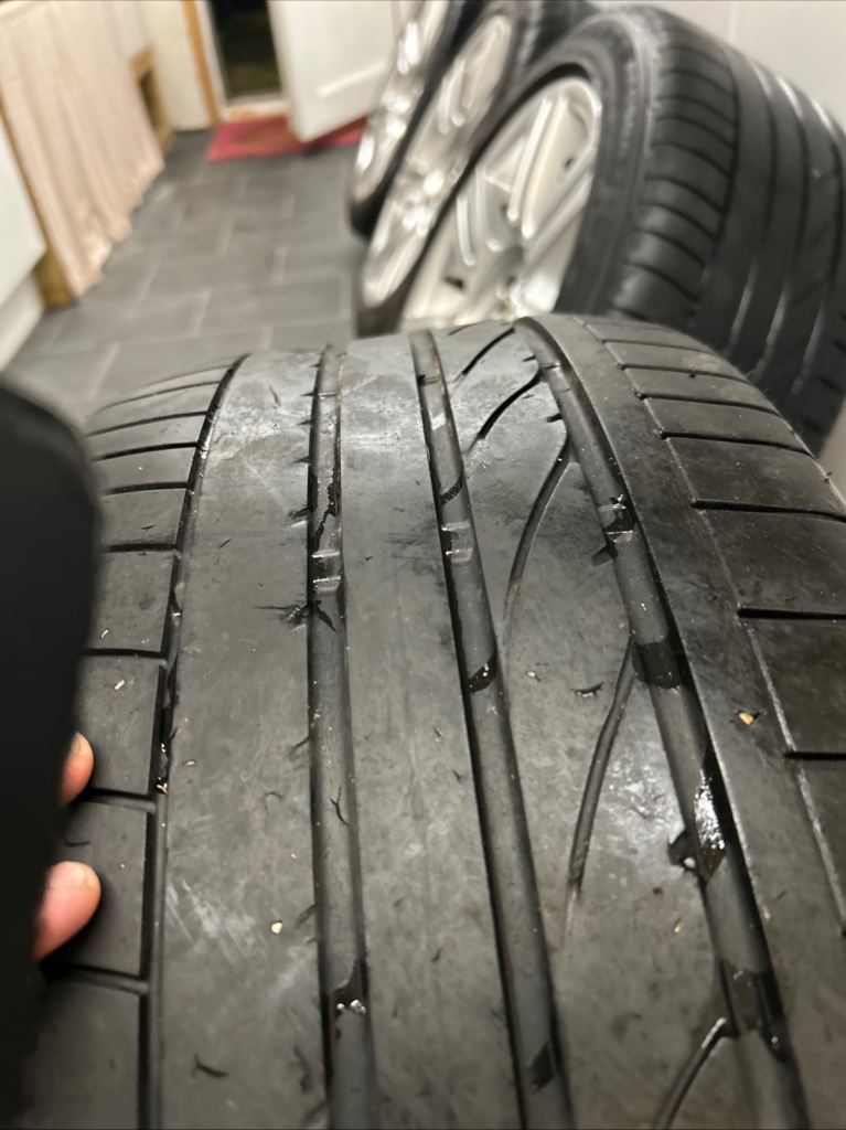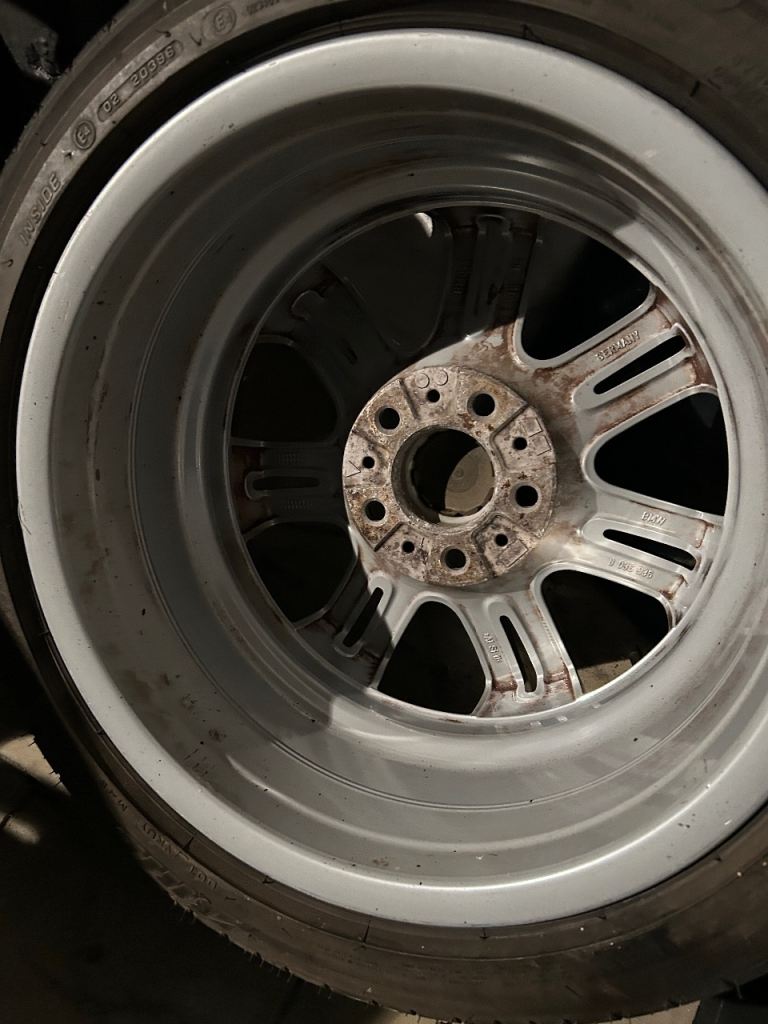 17” m sport alloys with run flats on good tyres on front rears a bit more worn wider rears