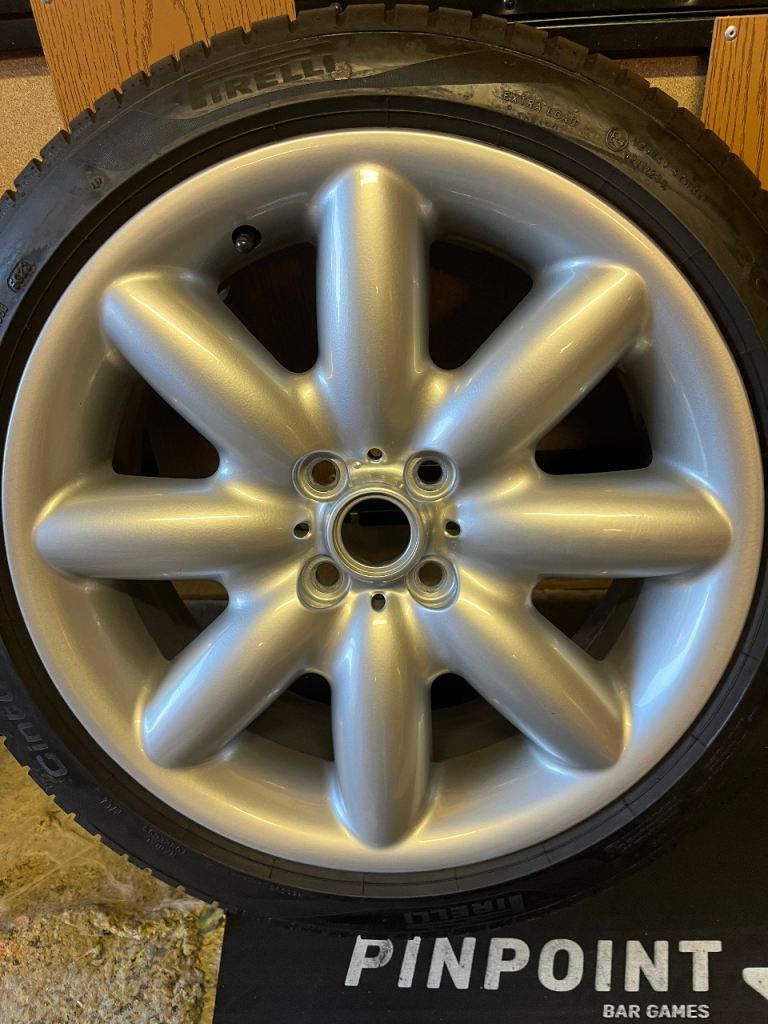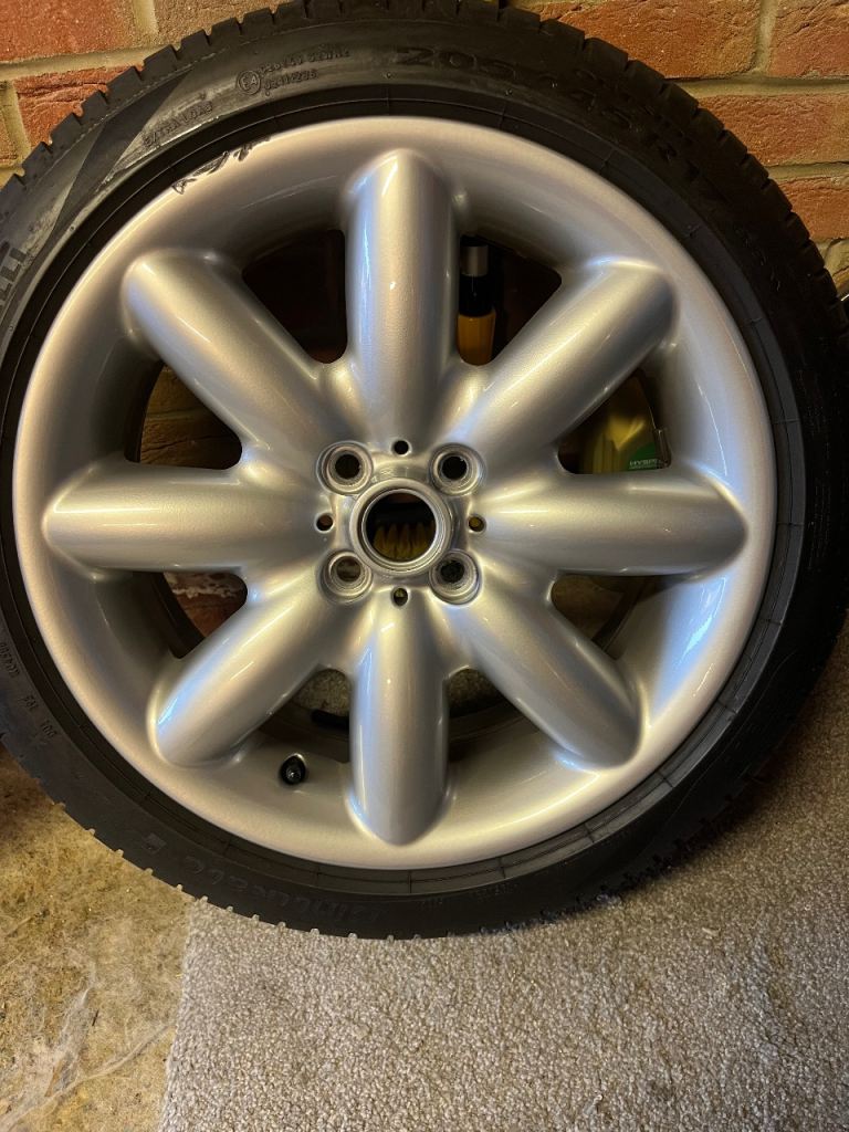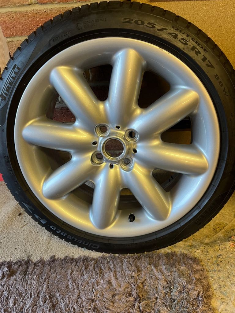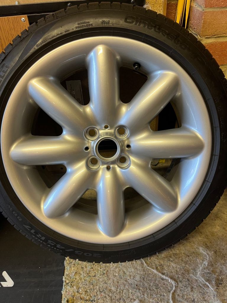 4 fully refurbished 17” Mini Cooper s alloy wheels. Comes also with 4 Pirelli cinturato tyres with all over 6.5mm of tread on. One alloy wheel has a slight mark otherwise the other 3 are in mint condition. Pirelli tyres are fairly new and have maybe done a few hundred miles at an absolute maximum. Open to offers as well. Pirelli tyres alone cost over £480.
